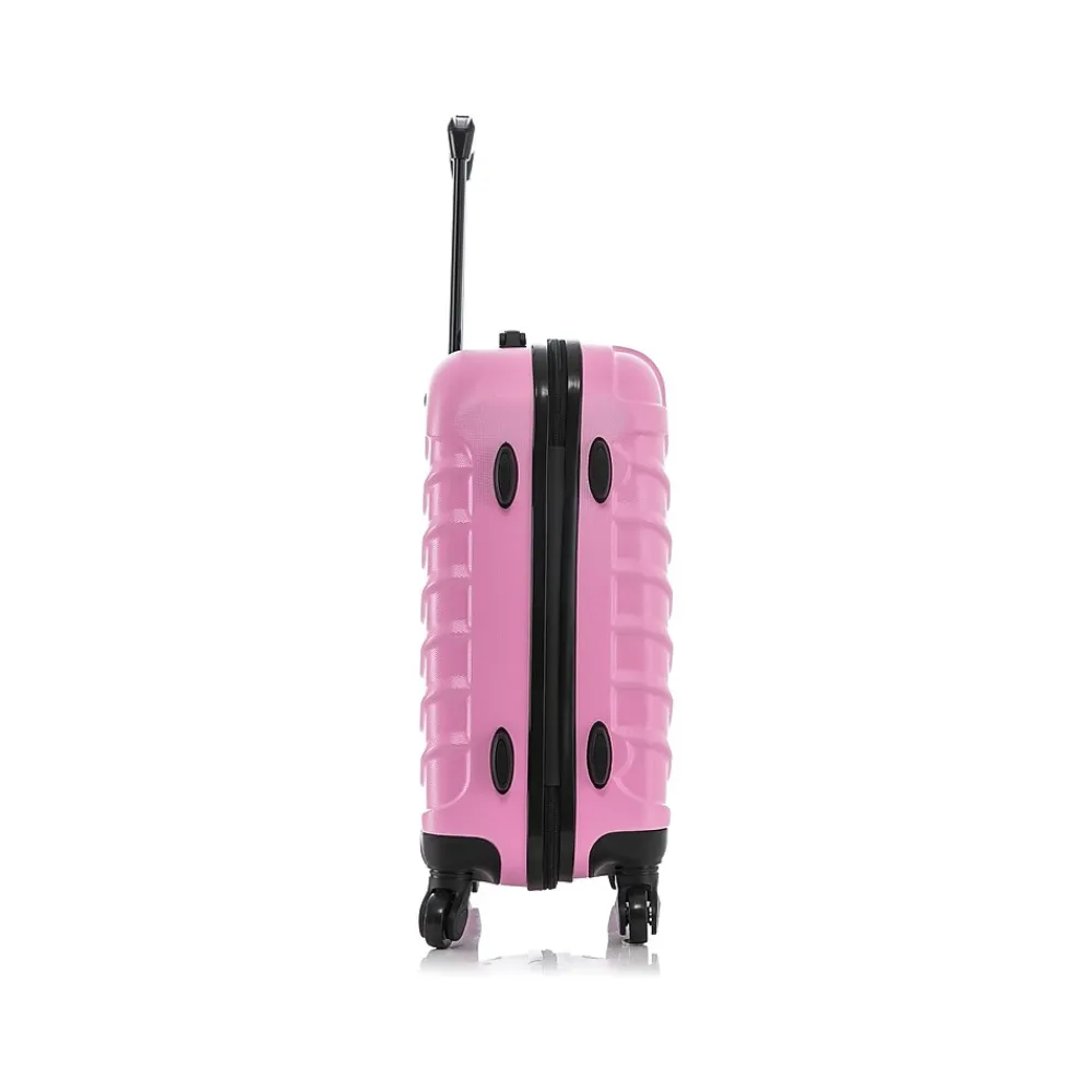 The InUSA Endurance 20″ hardside spinner luggage has a retractable trolley system, four spinner wheels, and ergonomic handles for comfortable transportation. The interior is fully lined and includes zippered compartments and elastic cross straps, while the luggage can stand upright.