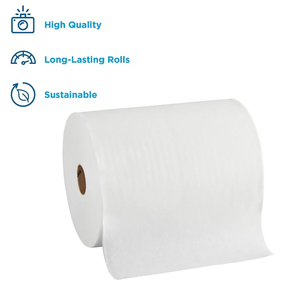 Keep busy restrooms or cleaning supply carts stocked with these recycled paper towel rolls. The high-capacity format delivers 800 feet of towels with a single roll, reducing the number of replacements needed. These enmotion hardwound paper towels are soft on skin but tough for heavier cleanup, making them a perfect choice for stocking restrooms, supplying kitchens or keeping on hand near any sink.