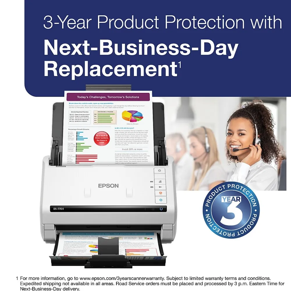 The perfect choice for heavy-use environments, the fast, efficient DS-770 II document scanner delivers high-quality scans up to 45 ppm/90 ipm. It features a robust 100-page Auto Document Feeder and includes TWAIN and ISIS drivers for easy integration with most existing professional document management systems. A peak daily duty cycle up to 7,000 sheets helps enhance productivity for busy workgroups. The DS-770 II scans to online storage accounts, so you can efficiently send critical documents to their destination. And, it’s all backed by an industry-leading 3-year limited warranty, with an Advance Exchange program featuring free Next-Business-Day shipping.