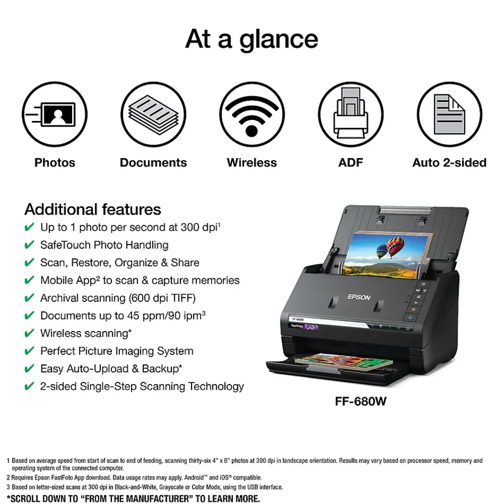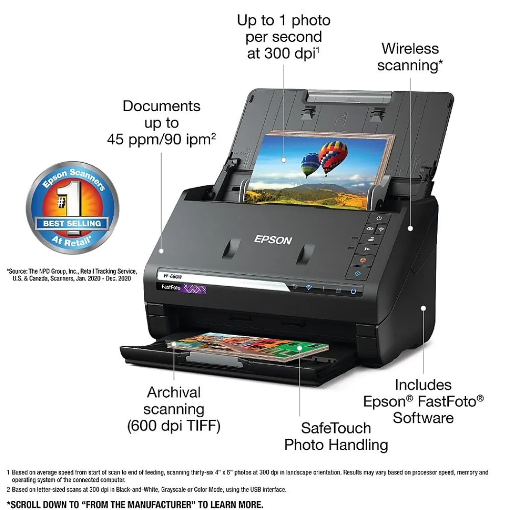 Preserve what’s priceless with the Epson FastFoto FF-680W — the World’s Fastest Personal Photo Scanner. Scan thousands of photos — as fast as 1 photo per second. Easily restore, save, organize and share photos, postcards, panoramas, documents and more. The convenient mobile app enables you to capture the voice of loved ones and create slideshows, so you can easily share stories about your photos right from your smartphone, from a firsthand perspective, for generations to come. Plus, FastFoto brings old photos to life with auto enhancement, color restoration and more. Offering the ultimate in versatility, it includes a variety of format options for quick sharing, archiving and enlargements.