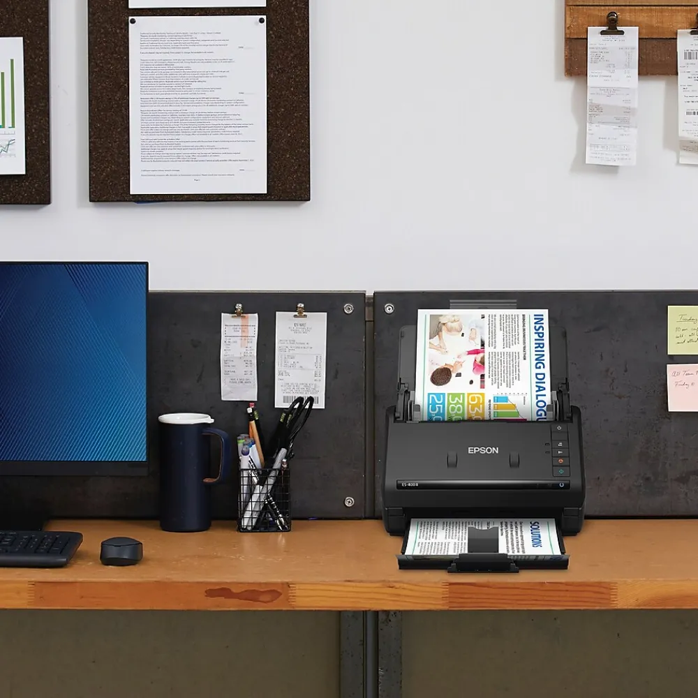 Get organized fast with the WorkForce ES-400 II duplex desktop document scanner. This reliable, easy-to-use performer speeds through scans up to 35 ppm/70 ipm, capturing both sides of each sheet in one pass. Its 50-sheet Auto Document Feeder allows you to breeze through stacks of documents of varying sizes. Intuitive Epson ScanSmart Software means you can easily preview, email and upload your scans. The included TWAIN driver ensures compatibility with most document management software. Scan to cloud storage accounts or searchable PDFs. Color and image adjustment features such as auto crop, dirt detection, staple protection and paper-skew correction help ensure remarkable image quality, whatever the scan.