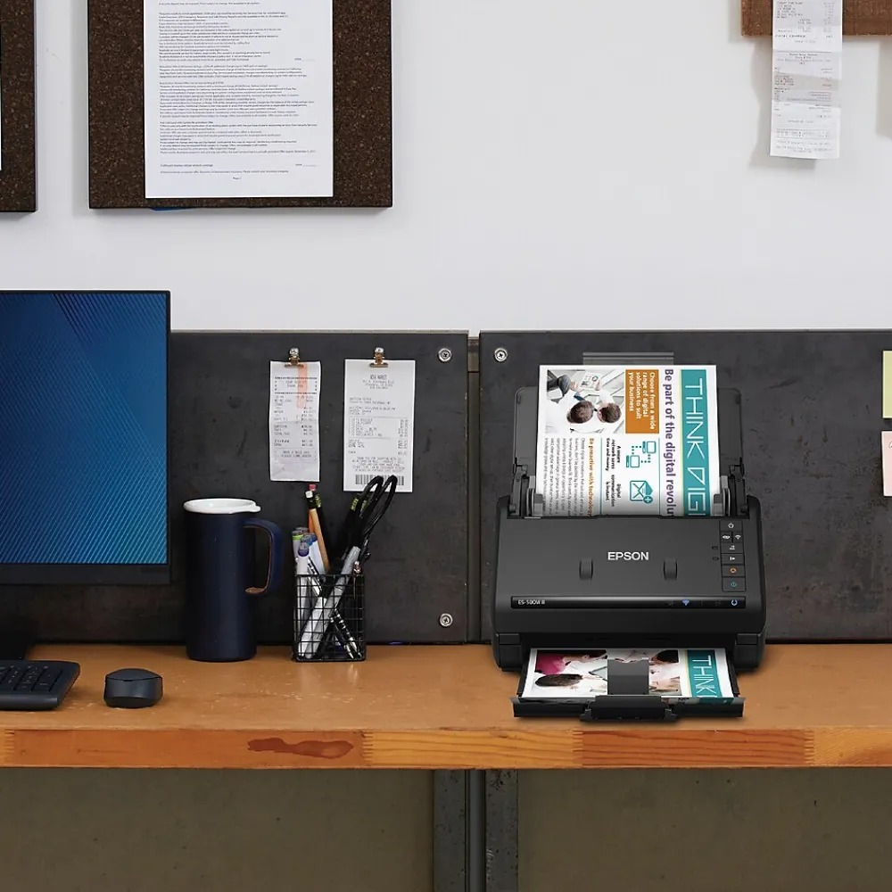 Get organized fast with the WorkForce ES-500W II wireless duplex desktop document scanner. This reliable, easy-to-use performer speeds through scans up to 35 ppm/70 ipm, capturing both sides of each sheet in one pass. Its 50-sheet Auto Document Feeder allows you to breeze through stacks of documents of varying sizes. Intuitive Epson ScanSmart Software means you can easily preview, email and upload your scans. The included TWAIN driver ensures compatibility with most document management software. Wirelessly scan to cloud storage accounts and create searchable PDFs. You can also scan directly from your mobile device using the Epson Smart Panel app. Color and image adjustment features such as auto crop, staple protection, dirt detection and paper-skew correction help ensure remarkable image quality.