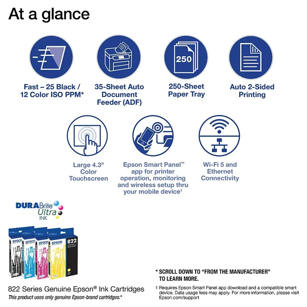 - Easy to use — 4.3″ color touchscreen for quick navigation and control, plus all-new Epson Smart Panel App for enhanced connectivity and productivity from your mobile device