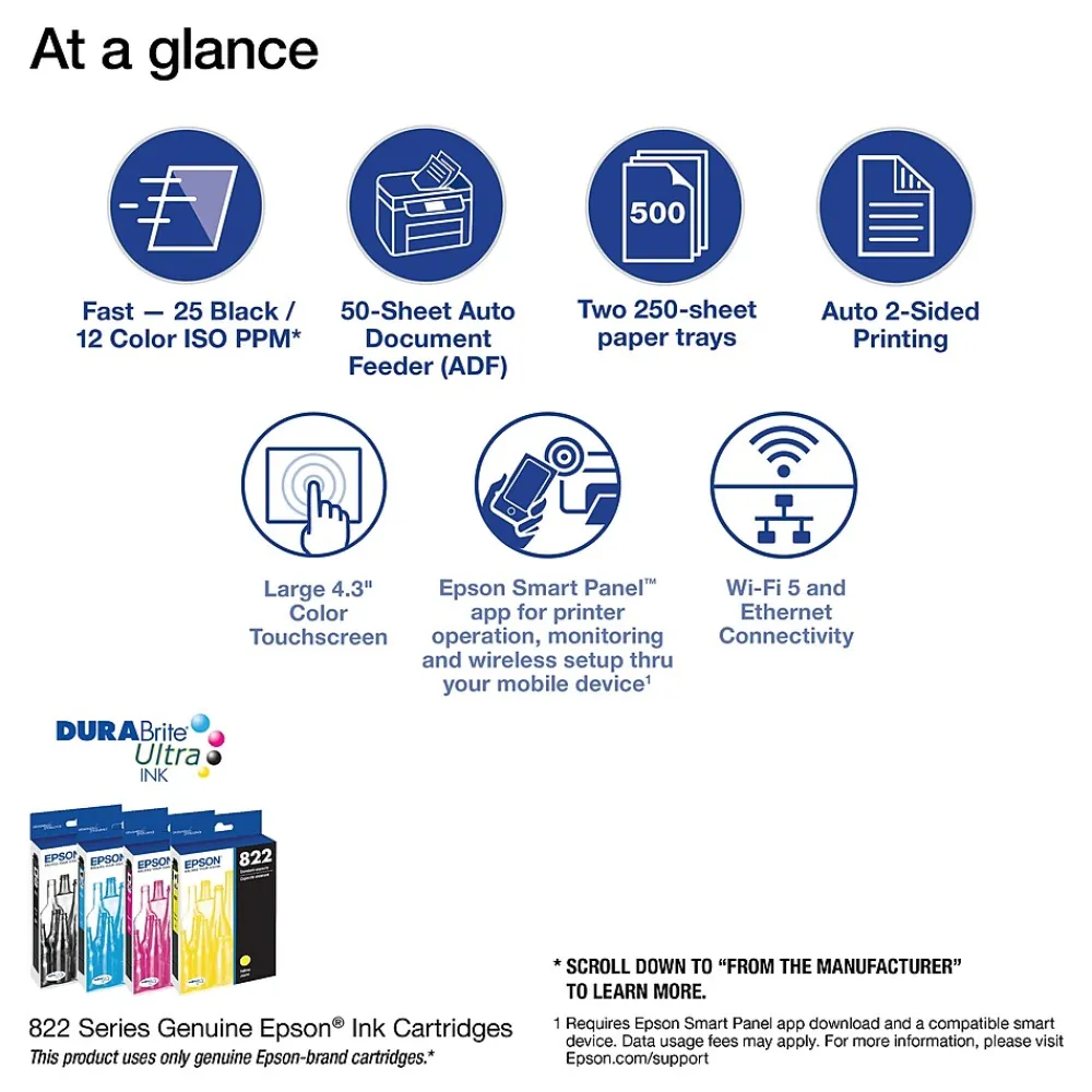 - Easy to use — 4.3″ color touchscreen for quick navigation and control, plus all-new Epson Smart Panel App for enhanced connectivity and productivity from your mobile device