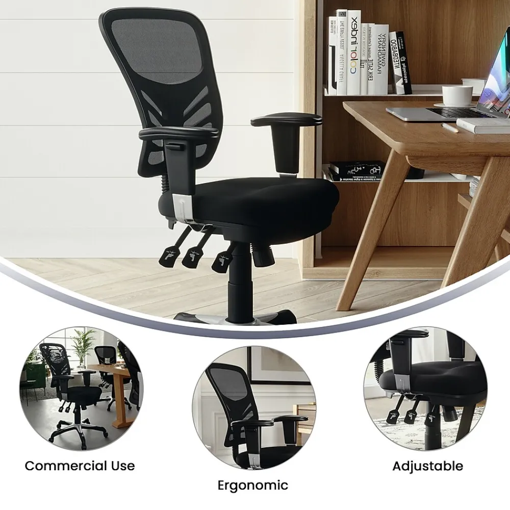 Get your work demands down to a minimum and produce your best work on this multifunctional swivel office chair. This chair comes fully loaded to help you take charge of your day. With a ventilated mesh back, you’ll have air circulating to your back giving you sweet relief during warm summer days. Make room for this modern beauty, upgrade everyone’s chair in the office, granting everyone the ability to have a customized seating experience. Standout features include: an adjustable back height knob; back angle paddle; tilt control paddle; curved back with substantial lumbar support; contour padded swivel seat; adjustable height arms provide relief to your neck and shoulders. Get a supportive ergonomic chair that can keep up with long 8 to 10 hour shifts with ease. This chair is so comfortable it can also be used as a gaming chair while you revel in an intense game against online players.