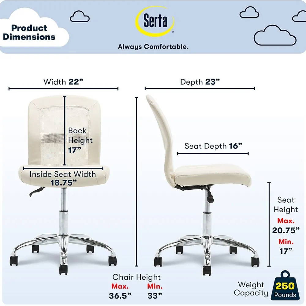 The Serta Essentials ergonomic computer chair is a great dorm or home office basic that’s affordable and looks great, too. This mid-back task chair is designed for comfort and suits any decor. Essential for dorms, bedrooms or home offices, this armless computer chair has everything you need to work in comfort and style.