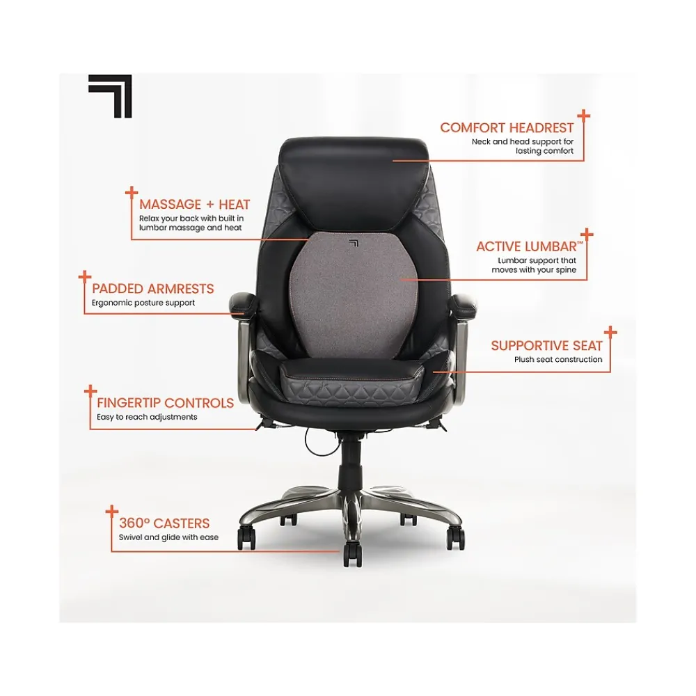 The Sharper Image S-600 executive massage chair with heat and Active Lumbar support is a perfect addition to the office. Active Lumbar support moves with you, providing constant comfort. The chair features a supportive seat with multilayered plush construction and 360-degree casters.