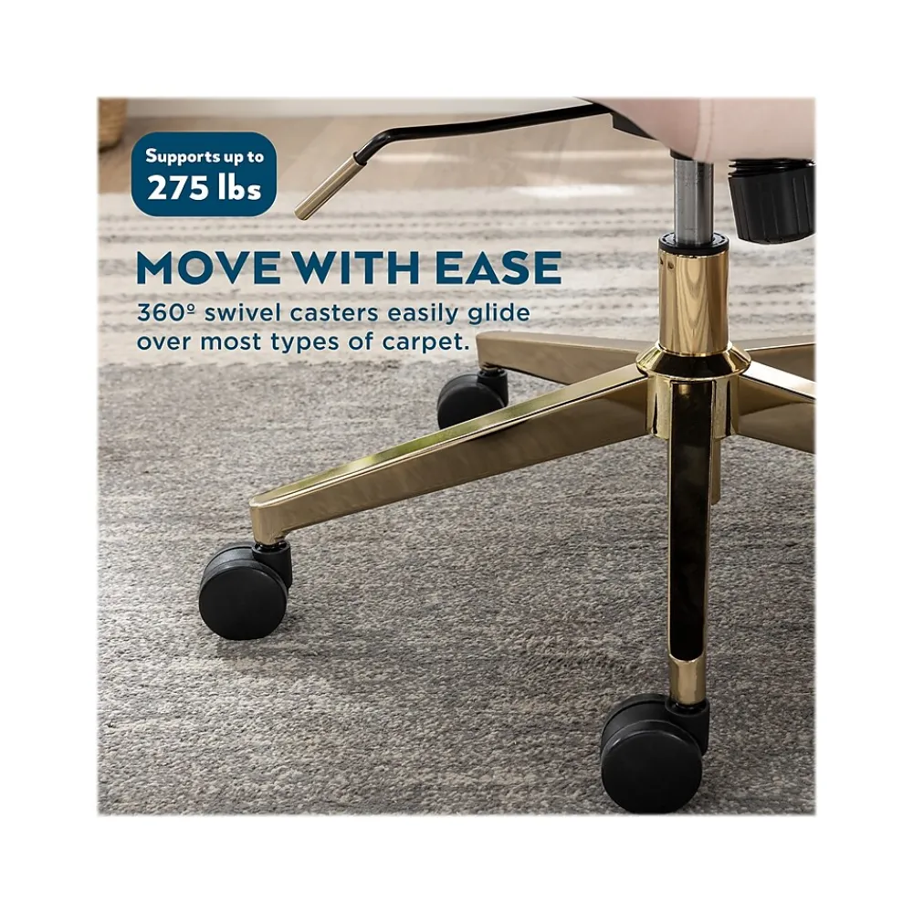 - Features a soft, velvety microsuede fabric upholstery in blush color with metal arms and a heavy-duty metal base in gold-tone plating