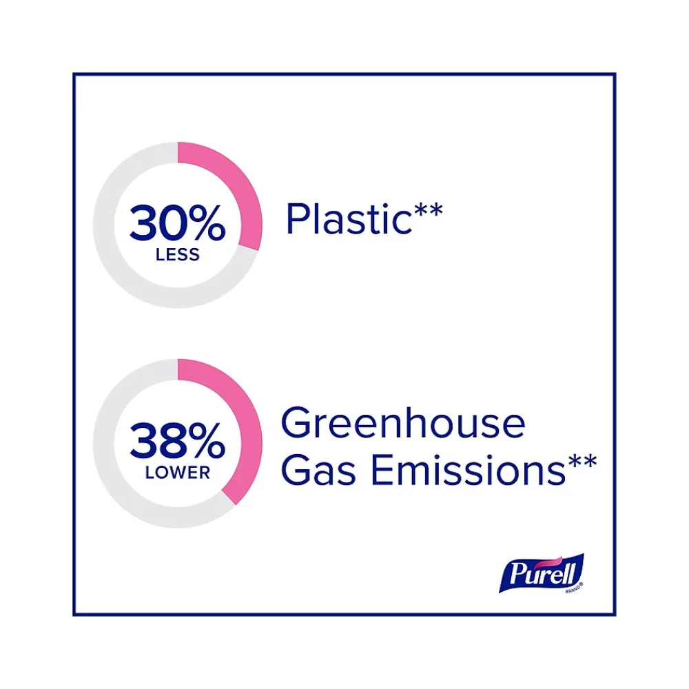 Purell ES10 automatic hand sanitizer dispenser requires less maintenance thanks to a fresh battery built into every refill, so you never have to change or buy batteries. Transparent refills make it easy to check product levels without opening the dispenser. Each refill has 30% less plastic and 38% lower greenhouse gas emissions for less waste. The refill bottle, collar, and AA battery are easy to pull apart and recycle. Its slim profile fits in tight spaces, and it quietly dispenses highly effective, rich foam hand sanitizer, delivering more ways to impress.