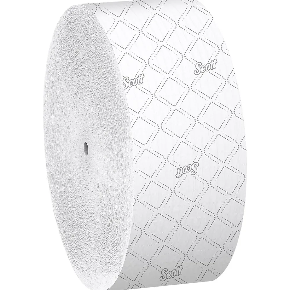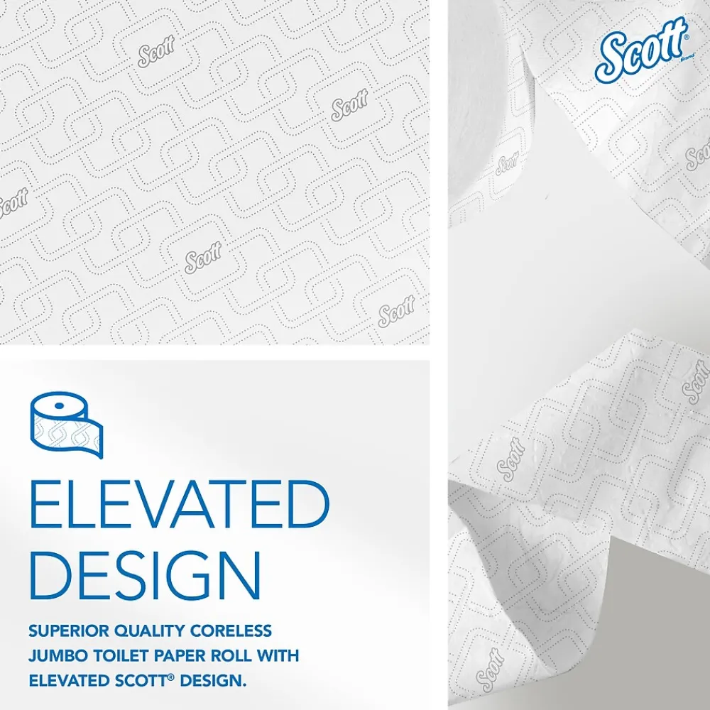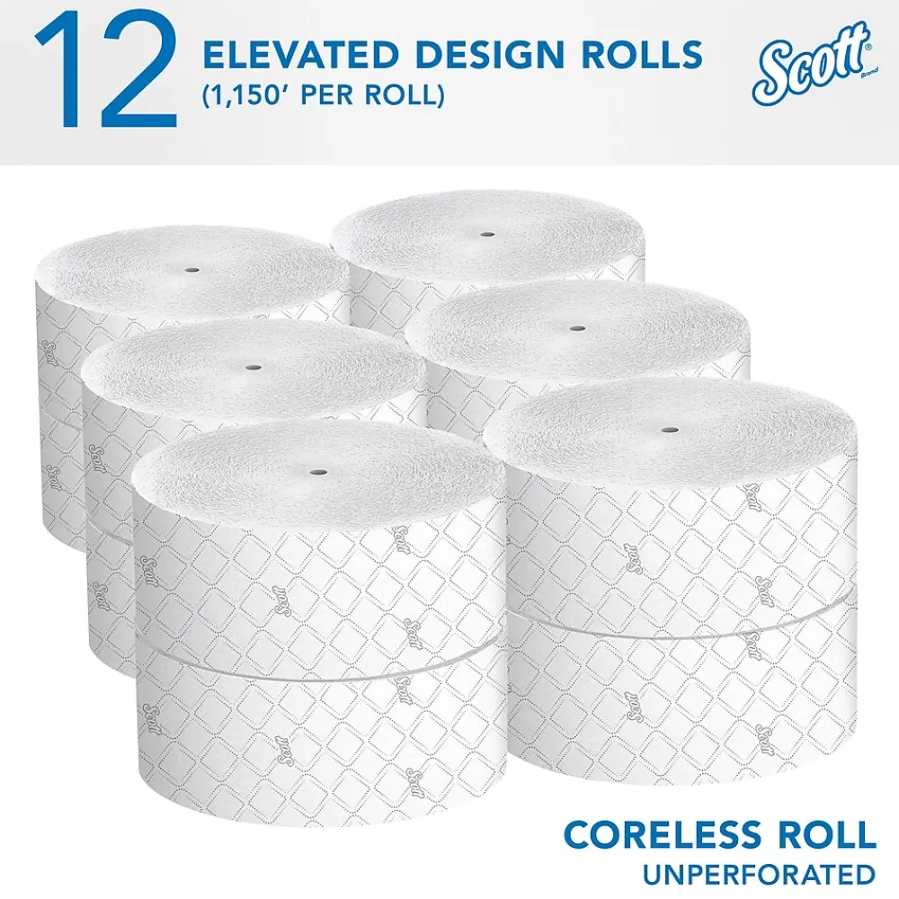 - 1,150’/Roll, 12 ScottĀ® Coreless High-Capacity Jumbo Roll Toilet Paper Rolls/Case; 13,800’/Case; 2-Ply; White; with Elevated Design