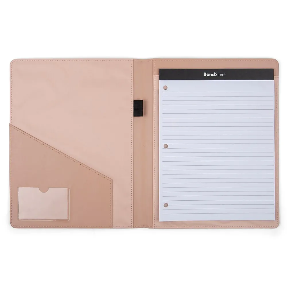 Project a professional image at work and in meetings with the Bond Street synthetic leather writing case with a pad. This premium-looking synthetic leather case has a letter-sized pocket on the inside front cover as well as a quick-access open pocket for loose items, an ID window, and a built-in pen holder. The writing case includes a letter-size ruled white writing pad which is quickly and easily replaced through a slit in the back cover.