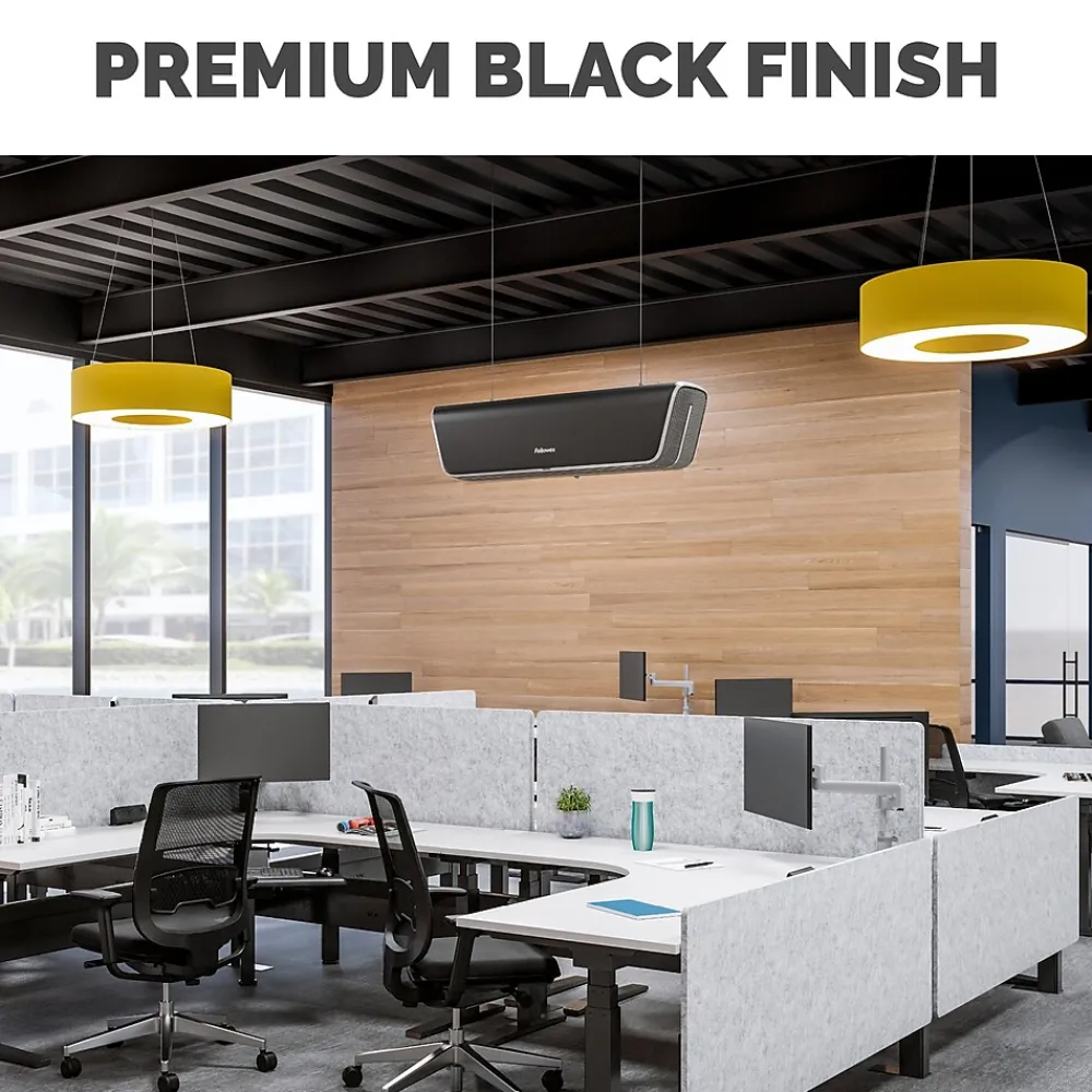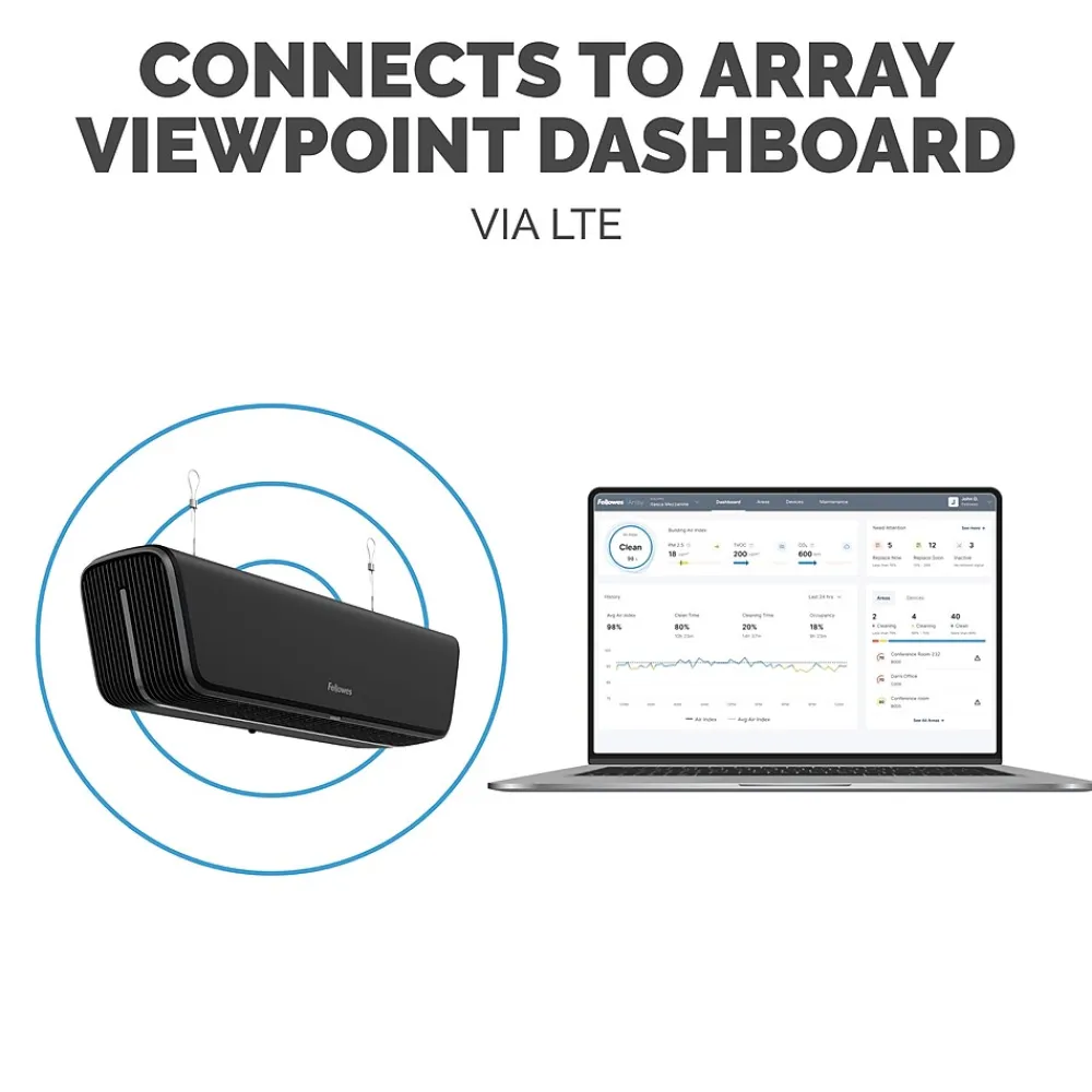 The Fellowes Array AC2 three-in-one filter (prefilter, carbon, and H13 True HEPA filtration) is 99.95% effective in capturing molecules as small as 0.1 microns, including viruses, allergens and germs, and is designed to last for 1 full year. This unit’s energy-efficient design includes a unique mixed-flow fan by Fellowes, designed to maximize air flow while delivering quiet operation. EnviroSmart+ technology includes a full suite of comfort and control sensors to continuously monitor contaminants, room occupancy, and noise levels to proactively respond to changes. This suite of indoor air quality (IAQ) sensors includes particulates (PM10, PM2.5), occupancy, temperature, humidity (rH), carbon dioxide (CO2), pressure, and TVOCs.