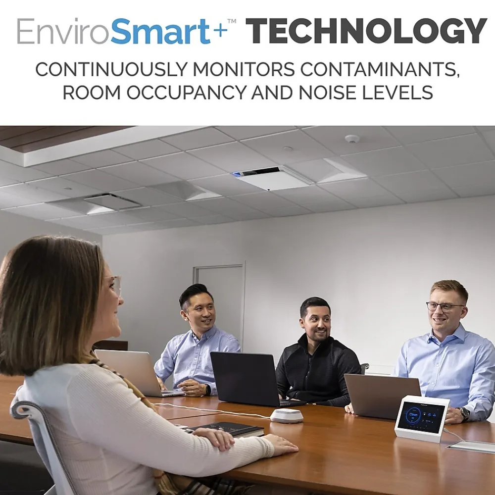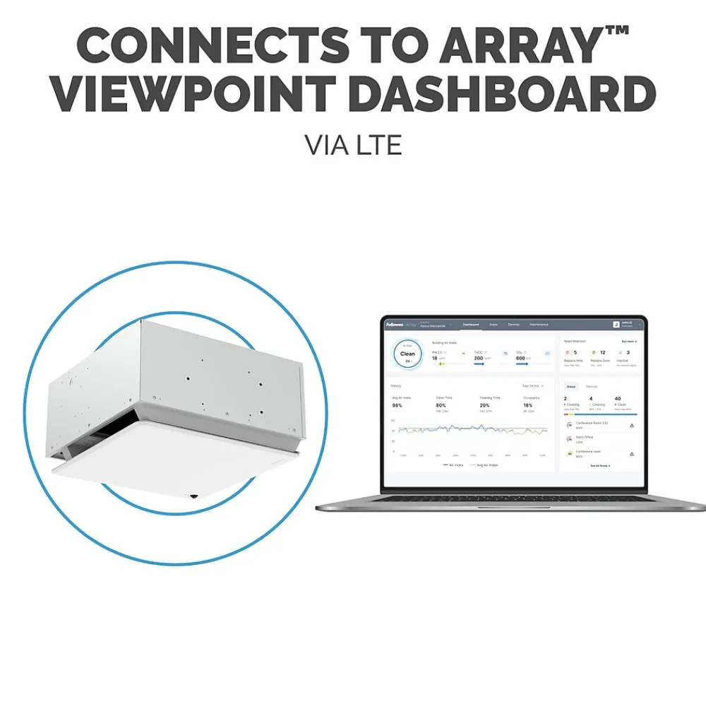 Inconspicuous and integrating beautifully with the majority of standard grid ceiling systems, the Fellowes Array AR1 three-in-one filter (prefilter, carbon, and H13 True HEPA filtration) is 99.95% effective in capturing molecules as small as 0.1 microns, including viruses, allergens and germs, and is designed to last for 1 full year. This recess unit’s energy-efficient design includes a unique mixed-flow fan by Fellowes, designed to maximize air flow while delivering quiet operation. EnviroSmart+ technology includes a full suite of comfort and control sensors to continuously monitor contaminants, room occupancy, and noise levels to proactively respond to changes. This suite of indoor air quality (IAQ) sensors includes particulates (PM10, PM2.5), occupancy, temperature, humidity (rH), carbon dioxide (CO2), pressure, and TVOCs.