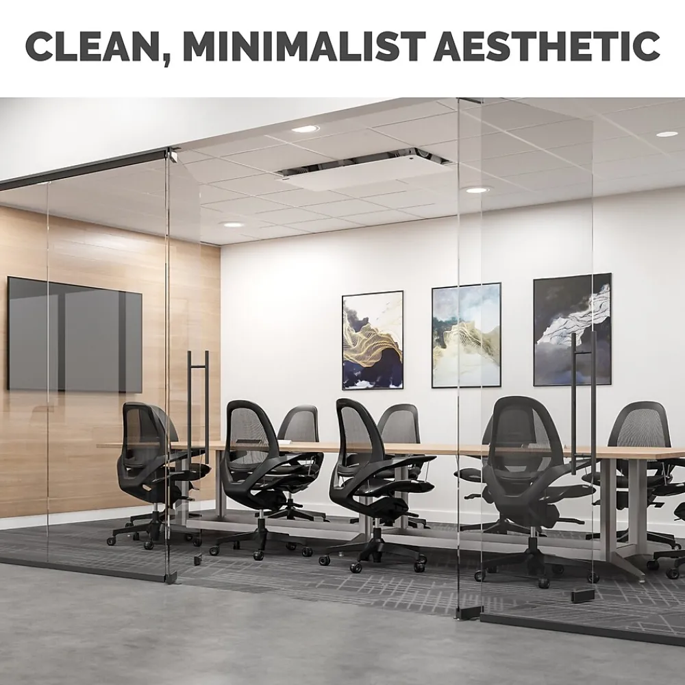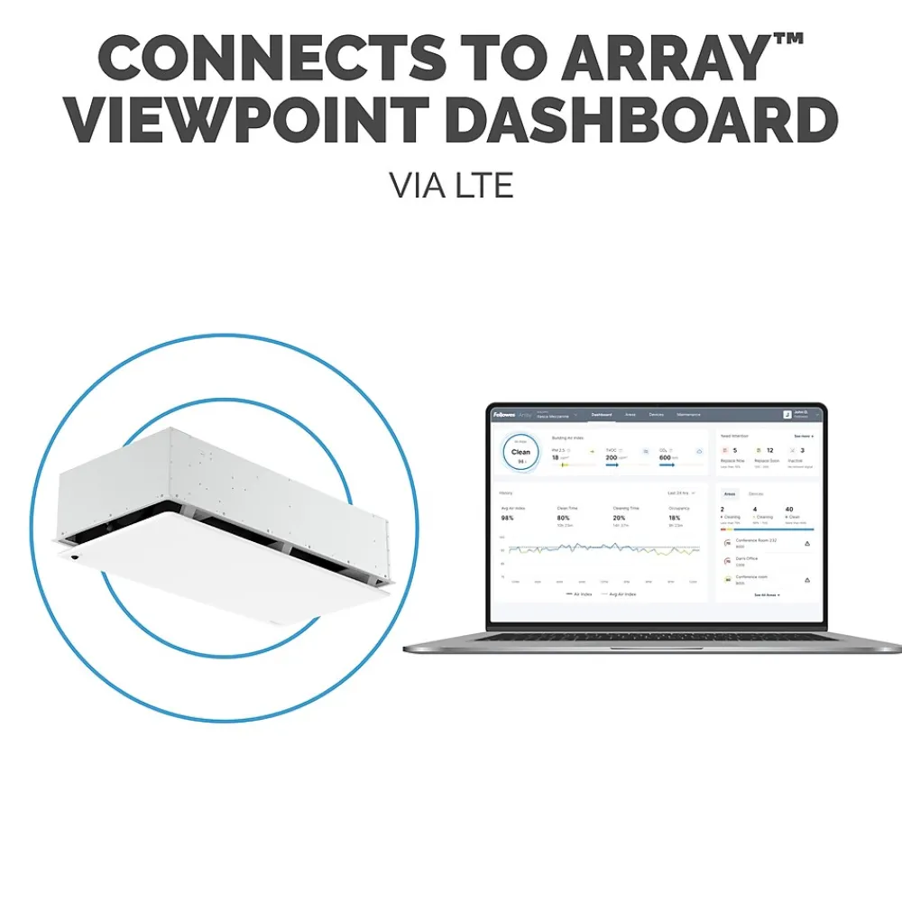 Inconspicuous and integrating beautifully with the majority of standard grid ceiling systems, the Fellowes Array AR2 three-in-one filter (prefilter, carbon, and H13 True HEPA filtration) is 99.95% effective in capturing molecules as small as 0.1 microns, including viruses, allergens and germs, and is designed to last for 1 full year. This recess unit’s energy-efficient design includes a unique mixed-flow fan by Fellowes, designed to maximize air flow while delivering quiet operation. EnviroSmart+ technology includes a full suite of comfort and control sensors to continuously monitor contaminants, room occupancy, and noise levels to proactively respond to changes. This suite of indoor air quality (IAQ) sensors includes particulates (PM10, PM2.5), occupancy, temperature, humidity (rH), carbon dioxide (CO2), pressure, and TVOCs.