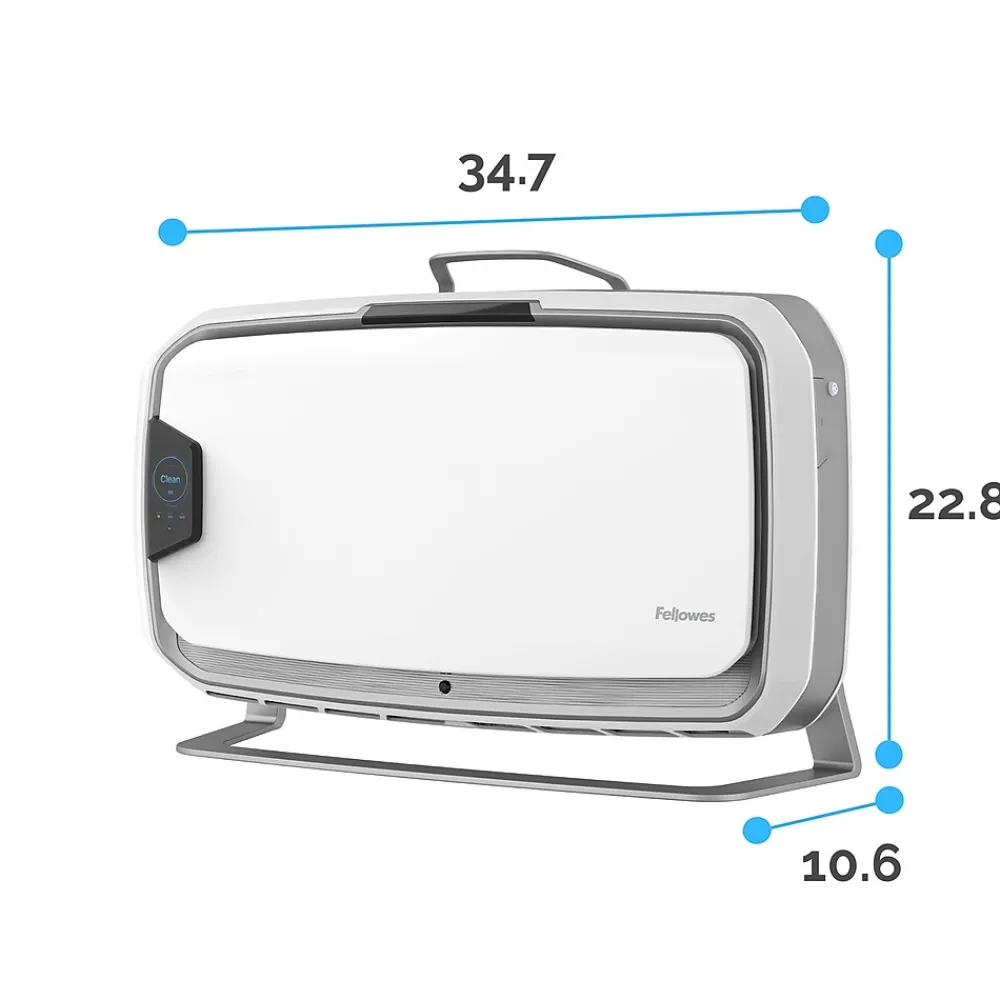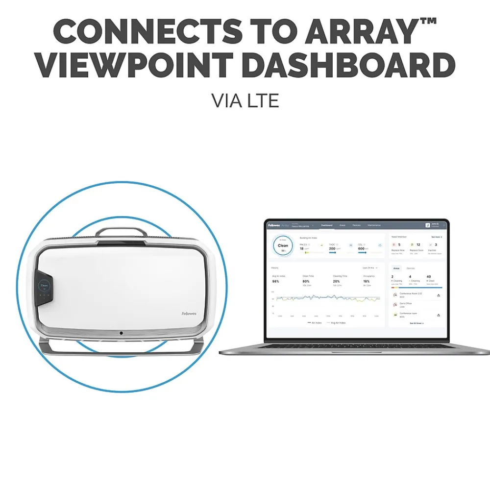 The Fellowes Array AS1 floor-standing air purifier can be installed on any flat surface. Clean, subtle design includes an integrated Lookout display showing users air quality status. The Fellowes three-stage filtration (prefilter, carbon, and H13 True HEPA) effectively removes at least 99.95% of particles as small as 0.1 microns, including allergens, such as pollen, dust, pet dander, and smoke. Equipped with EnviroSmart+ technology that includes a full suite of comfort and control sensors to continuously monitor contaminants (TVOCs, PM10, PM2.5), room occupancy, and noise levels, temperature, humidity (rH), carbon dioxide (CO2), and pressure to proactively respond to changes.