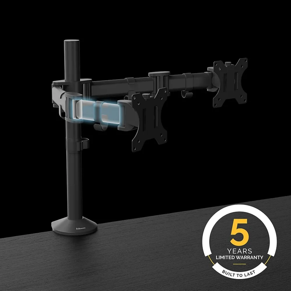 Elevate your monitor to maximize desk space and reduce eye, neck, and shoulder strain. This Fellowes monitor stand 8502601 is fully height- and depth-adjustable for optimum viewing control and a cost-effective ergonomic solution. The monitor arm features a dual design with built-in cable management to keep you tangle-free. Easy install using the quick fit VESA plate with either a desk clamp (0.38”-3.5” thick ) and grommet (0.44”-2.75” diameter) mount included for secure and easy attachment options. The Reflex experience has seamless adjustability with 360° rotation, 180° swivel, and +/- 45° tilt for optimal viewing angles.