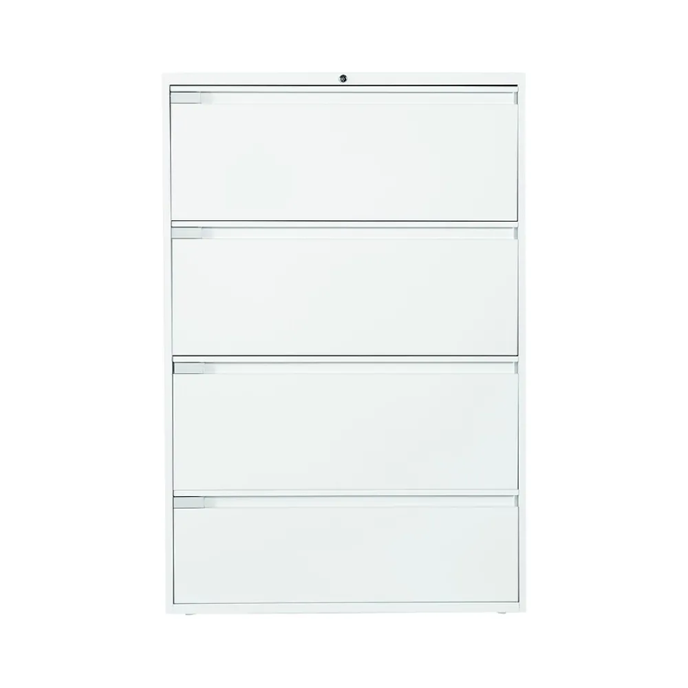 - Four-drawer lateral filing cabinet holds letter or legal-size documents