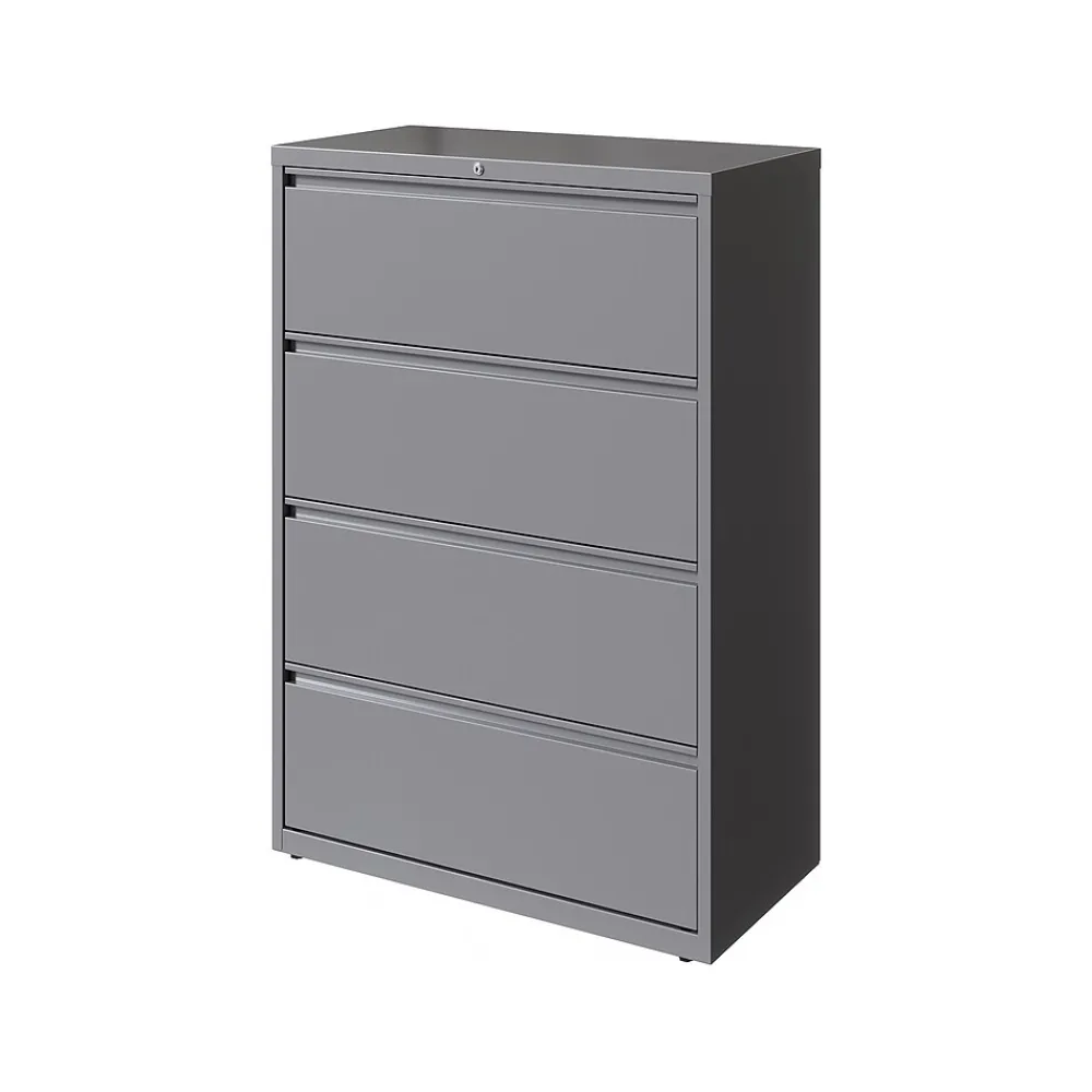 - Four-drawer lateral file cabinet holds letter-, legal-, or A4 size documents