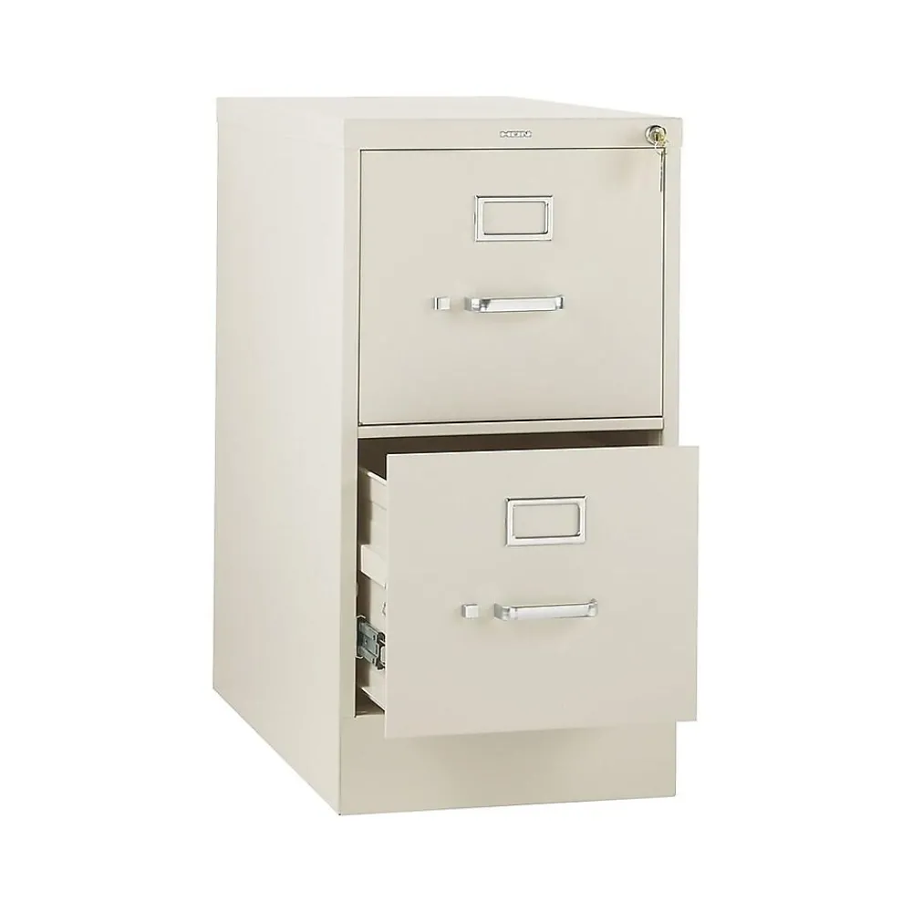 - Two-drawer vertical filing cabinet holds letter-size documents