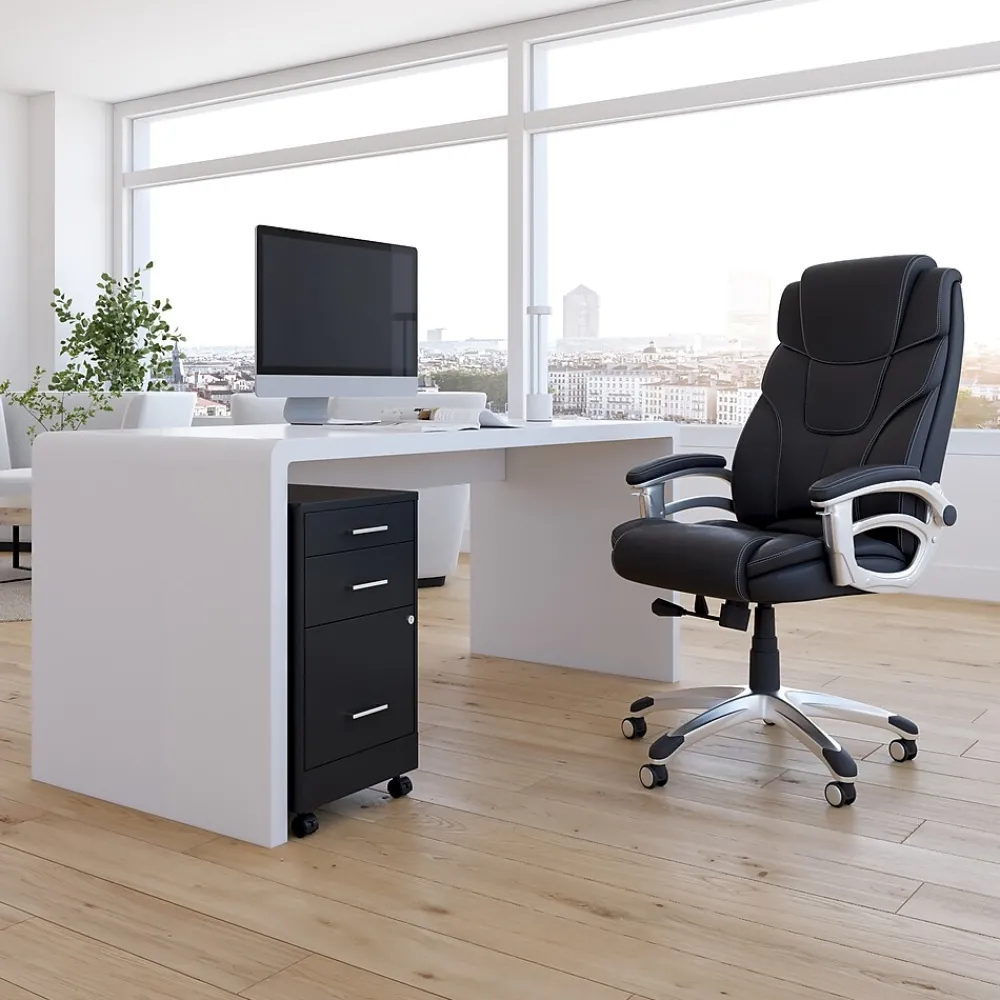 Expand your available storage options with this mobile file cabinet. Two box drawers offer space for office supplies, personal belongings and other small items, while the letter-size file drawer keeps paperwork close at hand. A keyed lock system prevents unauthorized access, keeping contents stored securely inside. This cabinet features rolling casters, so you can move your documents virtually anywhere in your workspace. With its compact size, this three-drawer vertical file cabinet fits neatly under a desk or in smaller spaces.