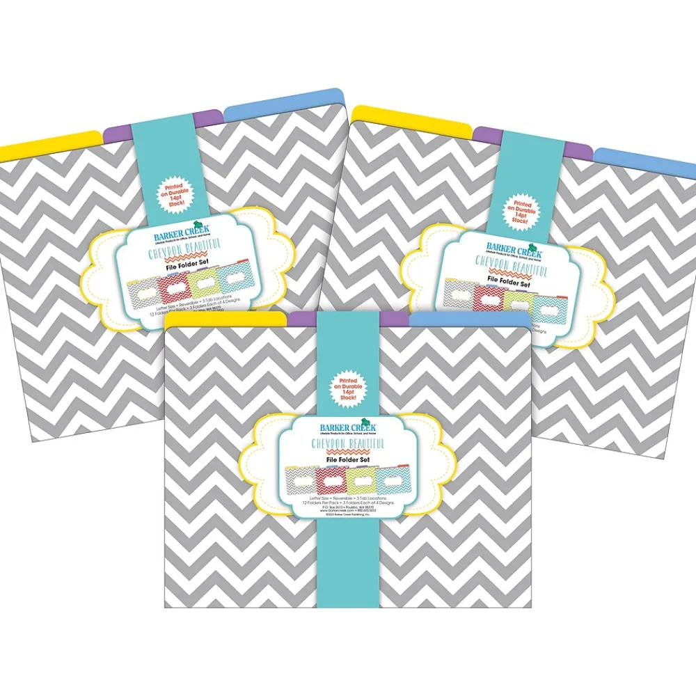 Barker Creek’s Beautiful Chevron Letter-Size File Folders are an affordable way to organize your office, classroom, or home with style and flair. This set of stylish desk accessories includes 36 file folders – nine each of four designs. The folders are 1/3 tabbed, which means that they have three tab positions – twelve folders are tabbed on the left, twelve folders are tabbed in the center, and twelve are tabbed on the right. The 14-point stock makes these folders perfect for desktop filing, meeting handouts, and student papers. These Beautiful Chevron file folders come with a preprinted “label” on the front for adding a table of contents, highlighting meeting agendas, listing the names of team members, bulleting travel itineraries, and so much more. These unique office supplies are fully reversible, each folder having a multicolored design on one side and a soft, solid color on the reverse side. The possibilities are limited only by your imagination! Coordinating products are available. Search: Barker Creek Chevron.