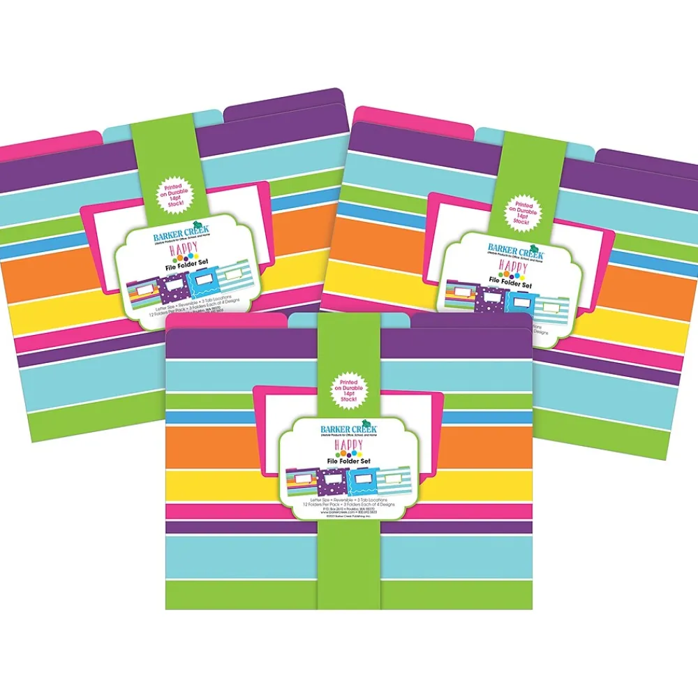 Barker Creek’s Happy Letter-Size File Folders are an affordable way to organize your office, classroom, or home with style and flair. This set of stylish desk accessories includes 36 file folders – nine each of four colorful designs. The folders are 1/3 tabbed, which means that they have three tab positions – twelve folders are tabbed on the left, twelve folders are tabbed in the center, and twelve are tabbed on the right.The 14-point stock makes these folders perfect for desktop filing, meeting handouts, and student papers. These Happy file folders come with a preprinted “label” on the front for adding a table of contents, highlighting meeting agendas, listing the names of team members, bulleting travel itineraries, and so much more. These unique office supplies are fully reversible, each folder having a multicolored design on one side and a soft, solid color on the reverse side. The possibilities are limited only by your imagination! Coordinating products are available. Search: Barker Creek Happy.