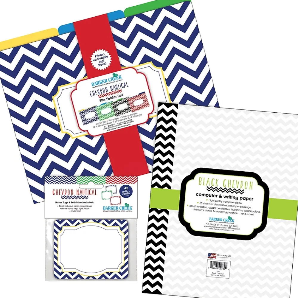 Barker Creek’s Nautical Chevron Get Organized Kit will help you stay on task in style! The file folders are printed on sturdy 14 point cardstock, feature 1/3 cut tabs, and are reversible. The self-adhesive labels measure 3.5″ x 2.75″ and work well as gift tags, name badges, address labels, and so much more! The coordinating paper is compatible with most laser and inkjet printers. Say goodbye to boring old office supplies and hello to fun and fashion! Coordinating products available: Search Barker Creek Chevron.