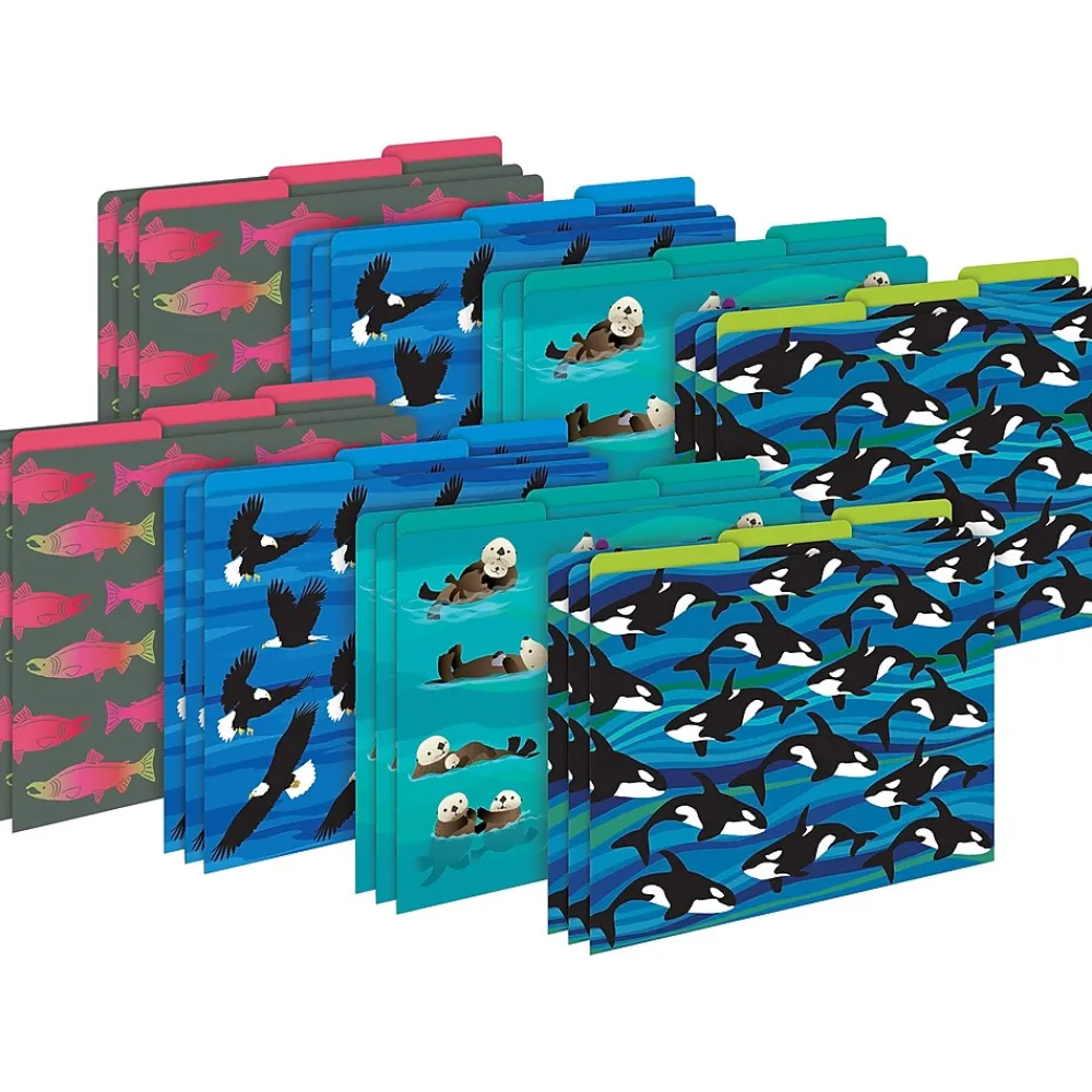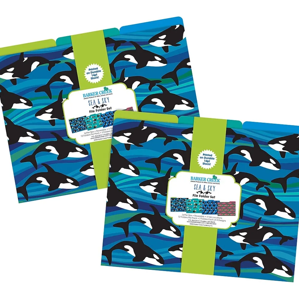 Barker Creek’s Sea & Sky letter-sized file folders are an affordable way to organize your office, classroom, or home with style and flair! The set includes 24 folders – six each of four beautiful designs. These folders feature orca whales, playful otters, American bald eagles, and sockeye salmon! Coordinating designs are printed on the inside making each folder fully reversible for added value! The tabs are 1/3 cut and the folders are printed on durable 14-point stock. In addition to being great for everyday filing needs, these folders are also perfect for presenting meeting handouts, organizing important papers, sending work home with students, storing treasured photos and archiving other significant mementos. The possibilities are limited only by your imagination! See Barker Creek’s full line of fashion-forward file folders!! Coordinating products available: Search Barker Creek Sea & Sky.