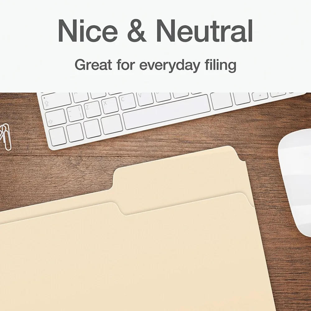 These Pendaflex File Folders are made from heavyweight 14 pt. paper to better withstand wear and tear. They come in a nice, neutral manila to match any home or office aesthetic. The 1/3 cut tabs come in 3 different positions (left, right, center), so you can see all of your labeled tabs in a file box or file drawer. Each folder fits letter-sized papers and is scored along the bottom for 3/4 inch expansion. Box of 100 manila file folders.