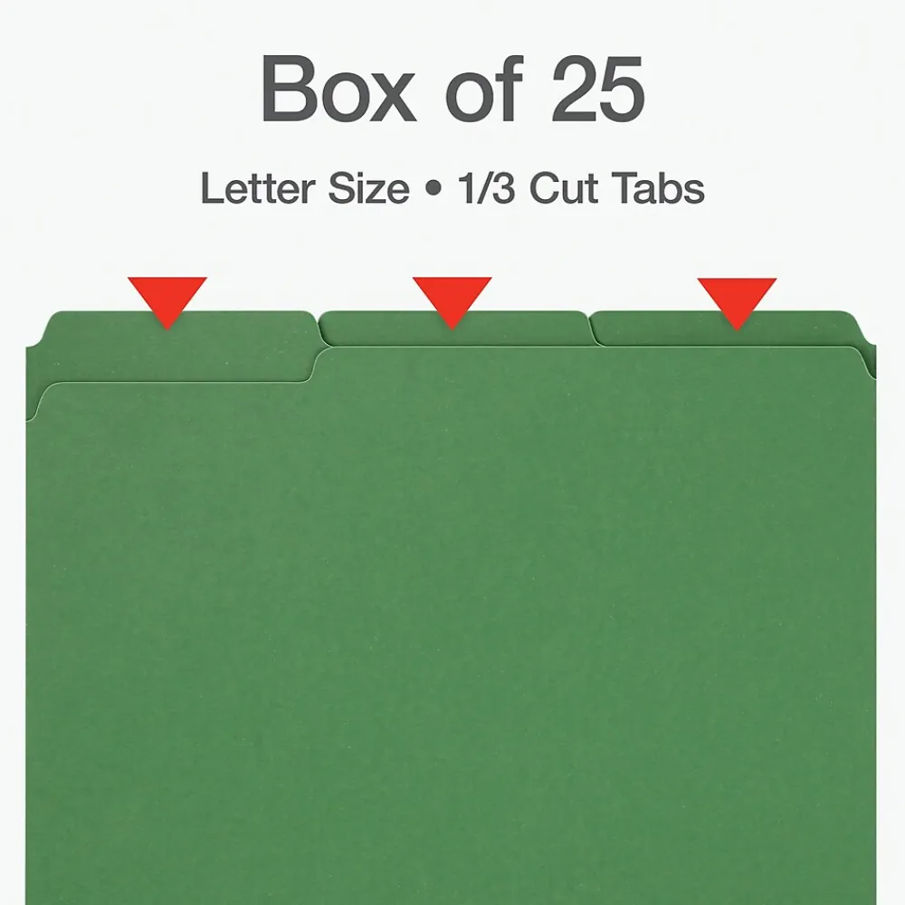 These Pendaflex File Folders are made from heavyweight 25 pt. pressboard to better withstand wear and tear. The 1/3 cut tabs come in 3 different positions (left, right, center), so you can see all of your labeled tabs in a file box or file drawer. Each folder fits letter-sized papers and is scored along the bottom for 1 inch expansion. Box of 25 green file folders.