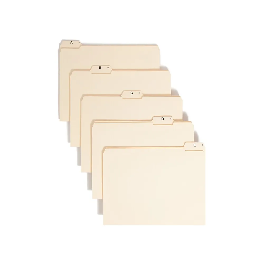 Get documents organized by sorting them into these letter-size alphabetic manila indexed file folders. The 11-point manila stock construction protects contents from everyday wear and tear, while the assorted tab positions make these folders simple to browse. This set of Smead letter-size indexed file folders features reinforced 1/5-cut tabs with bold preprinted letters for easy reading.