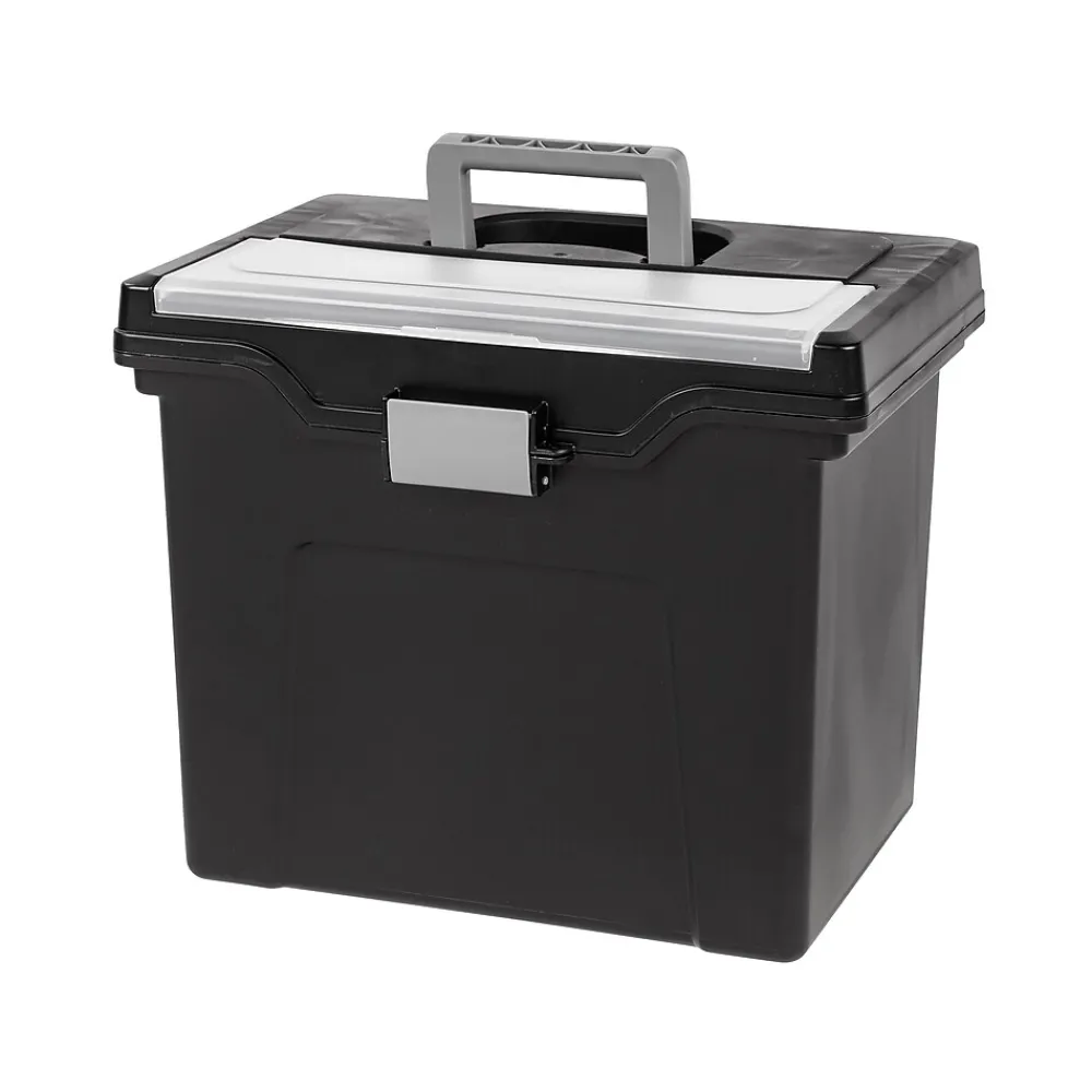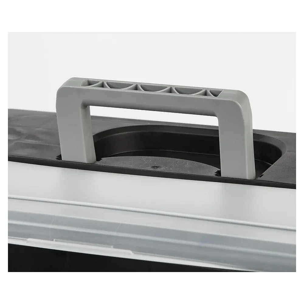 Stash forms, invoices, and other paperwork inside these portable file boxes. The organizer lids hold pens, pencils, and other small office supplies, while the snap-shut design keeps papers securely tucked inside the main compartment. Built-in guides along the edges accept hanging file folders to ensure documents remain easy to find. These IRIS letter-size file boxes boast convenient carrying handles, so you can take your paperwork wherever your business takes you.
