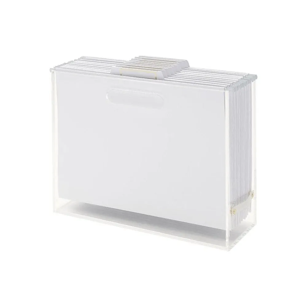 - Set includes: slim acrylic file box, white hanging file folders, and white file folders