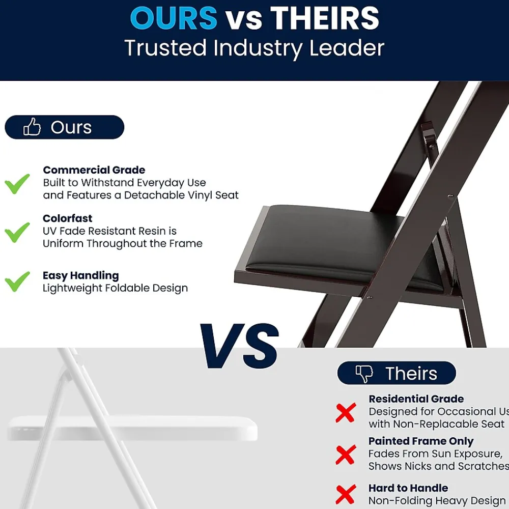 Commercial-grade resin folding chair with an upscale design making it the perfect special event chair. This product is engineered and built with premium materials that will withstand heavy duty use for event, business and home usage. These folding chairs will stack easily and feature a washable vinyl seat that can be replaced if damaged. Choose the color option that would best pair with your event needs. This is a commercial-grade, on-demand seating solution ideal for more formal occasions such as weddings, catered events or anniversary parties. Folding Chair Highlights: – Ready-to-use with no assembly required – Hassle free stackable storage – Replaceable seat prolongs the life of the chair – Floor caps to prevent surface and flooring damage – 1000LB weight capacity – These low-maintenance party event chairs wipe down easily after luncheons and stack neatly for storage or floor maintenance. Make a smart investment by purchasing multiple resin folding chairs for your rental business, banquet facility or event venue. Purchase our folding chair dolly for quick and easy set up and take down.