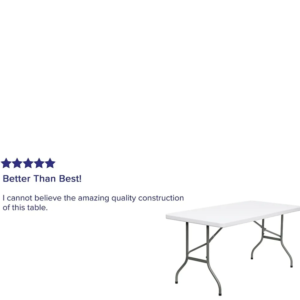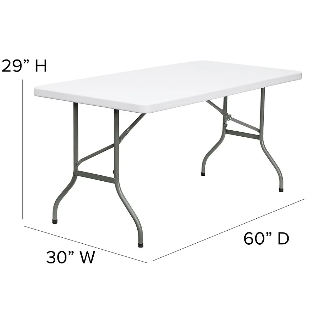 Ensure you have enough surface space for any function and take the stress out of hosting your next gathering. This rectangular folding table is 5 feet long and is beneficial in a multitude of settings that include banquet halls, conference centers, cafeterias, schools and in the home. Use as a temporary seating solution or setup for everyday use. This plastic folding table comfortably seats up to six adults while ensuring plenty of legroom. Speed up the time it takes to set-up and tear-down wedding receptions, graduation parties, banquets, buffets and other events with this folding table. Whether you’re hosting an indoor or outdoor gathering, the smooth design is easy to wipe clean. When using for outdoor events store indoors to protect the frame from extreme moisture. The table legs fold under for storage and provide better portability. This table is commercial grade to withstand everyday use in the hospitality industry.