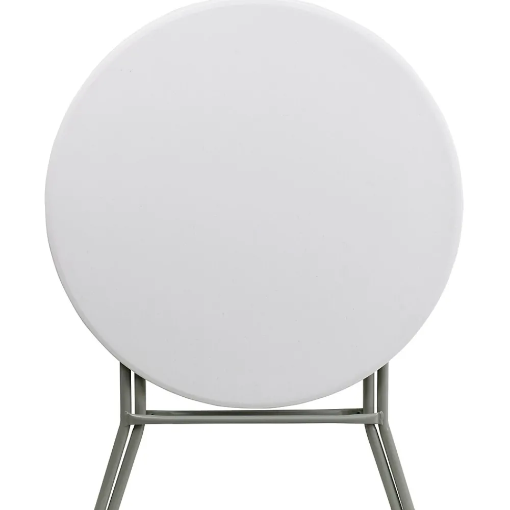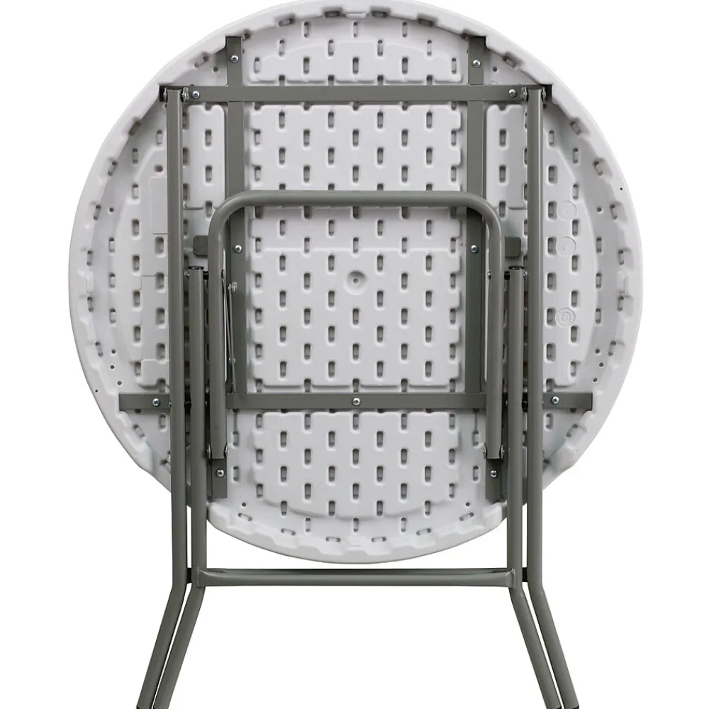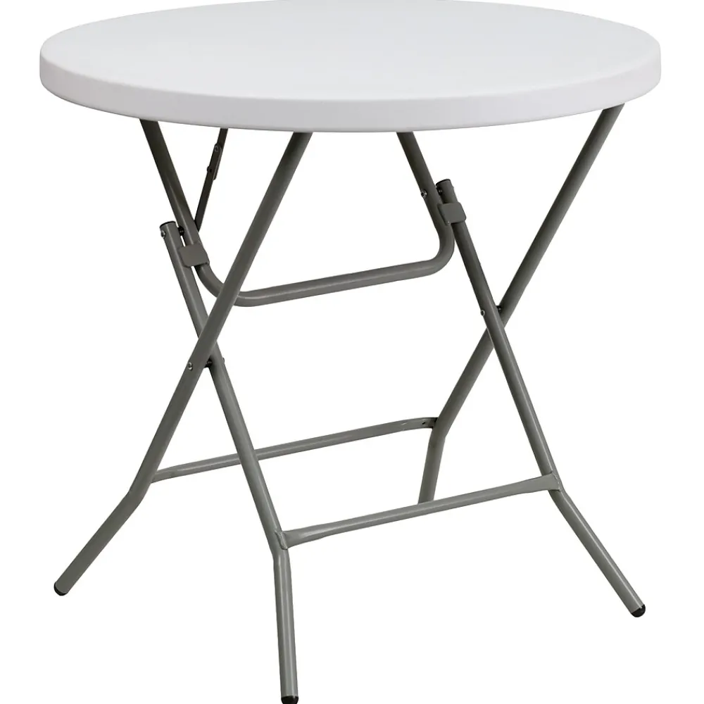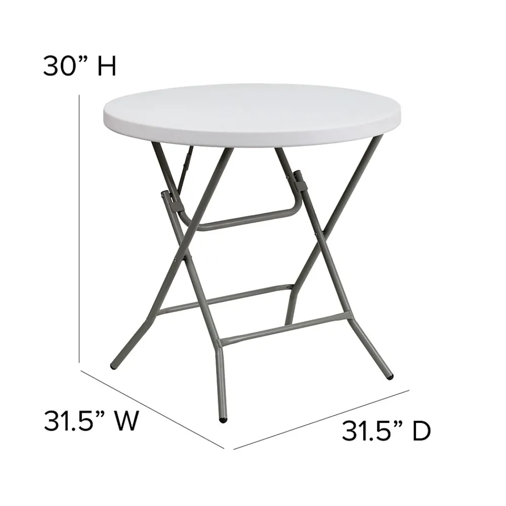 When you need a little extra surface area this folding table is the perfect choice. This plastic folding table is a convenient option when you need to set up tables for special events, cook-outs on your patio at home or when you’re serving snacks around the pool. This durable, easy to clean table is commercial rated for use in banquet halls, convention centers and at trade shows. The thick, granite white tabletop is 1.75″ thick, and will comfortably seat up to 3 adults. Its waterproof, impact and stain resistant top have a 220 pound static load capacity. Non-Locking gray powder coated cross legs fold to transport and store. Non-marring floor caps protect your floor by sliding smoothly when you need to move it. The 32″ Round Granite White Plastic Folding Table is a convenient option for your next home, school or business event. Designed for both indoor and outdoor use, store table indoors and protect the frame from extreme moisture.