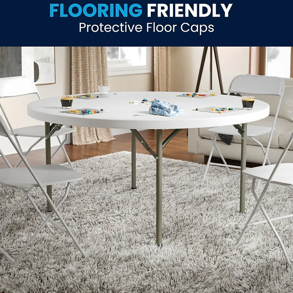 Ensure you have enough surface space for any function and take the stress out of hosting your next gathering. The round dining folding table is a great option for special event planners, catering companies and banquet facilities. This durable, easy to clean table is commercial rated for use in banquet halls, convention centers and at trade shows. Use during game night, dress it up for holiday parties, and coordinate crafts night. The thick, granite white tabletop is 60″ in diameter, 2″ thick, and will comfortably seat up to 8 adults. Its waterproof, impact and stain resistant top have a 880 pound static load capacity. Attractive gray powder coated legs lock securely in place while in use and non-marring floor caps protect your floor by sliding smoothly when you need to move the table. Designed for both indoor and outdoor use, store table indoors and protect the frame from extreme moisture. The 60″ Round Granite White Plastic Folding Table is a convenient option for your next home, school or business event.