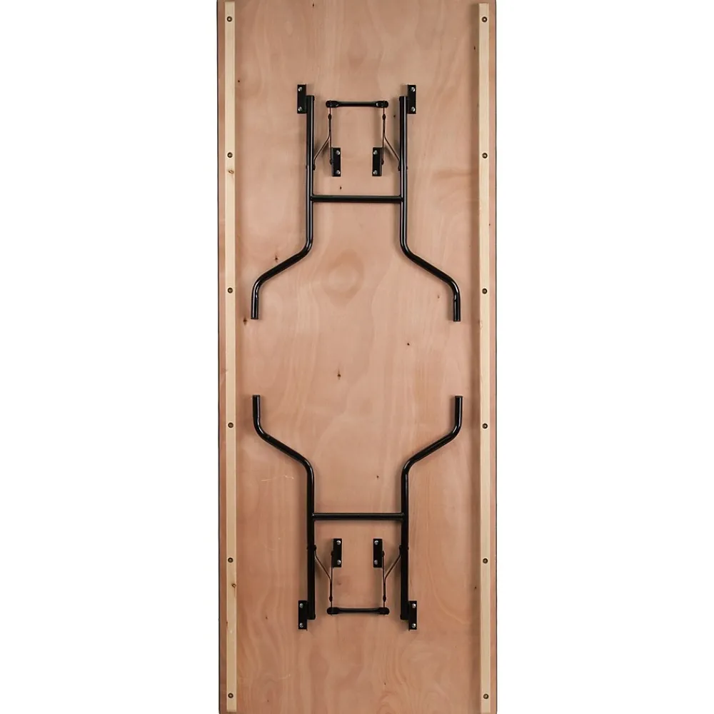 If you want a table that is sturdy, long-lasting and versatile enough to use anywhere this heavy duty folding table is as good as it gets! The Rectangular Wood Folding Banquet Table is a commercial grade table that can be used as a training table, trade show booth, or a banquet table. Featuring an Okoume hardwood surface, this table top is .75 inches thick, with a black T-mold edge band. Two heavy duty, wood runners, secured to the underside of the table, increase load capacity and allow for more secure stacking, transport and storage. The heavy duty wishbone legs lock securely in place when the table is in use. A black powder coating protects the legs from scratches, and non-marring floor caps protect your floor. This is a particularly good choice for party rental companies and other organizations that hold many events throughout the year.