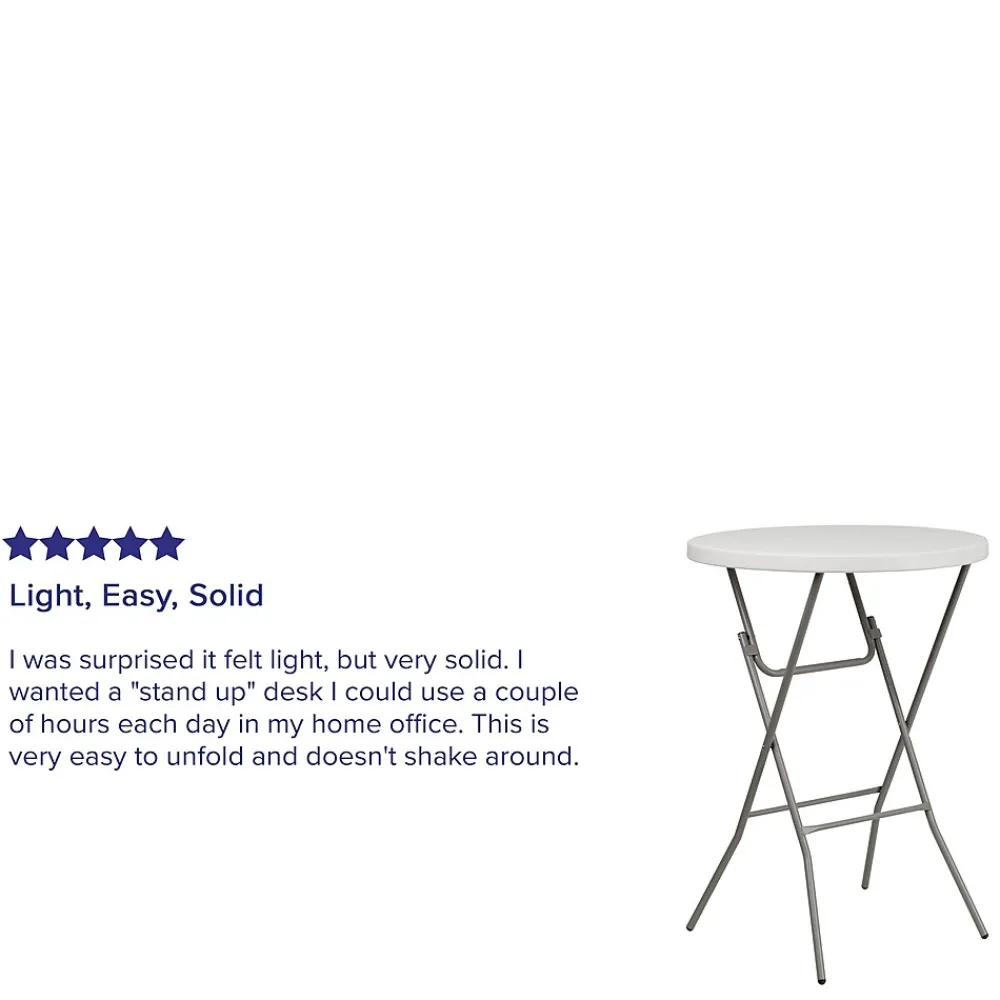 Host mixers at your venue for Wednesday Wind Down, make it a social setting incorporating these bar height cocktail tables. These pub tables encourage everyone to stand around and mingle as your mixologist serves up delicious signature drinks to keep people coming back to your lounge. When you invite friends over to your backyard bash this cocktail table is perfect for socializing or grabbing snacks poolside. This table can comfortably seat up to 3 adults to enjoy friendly conversation. Let the birthday girl shine at her own table while everyone sits at table height tables. The legs fold flat to transport and store away. These event tables are a must have for your event rental business or banquet hall to add variety to your seating. Although designed for indoor events this party table can be used outdoors on the deck or patio during good weather but must be stored indoors.
