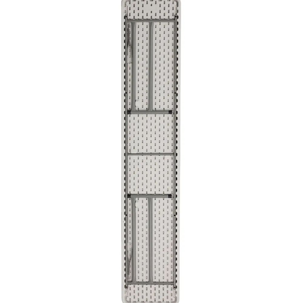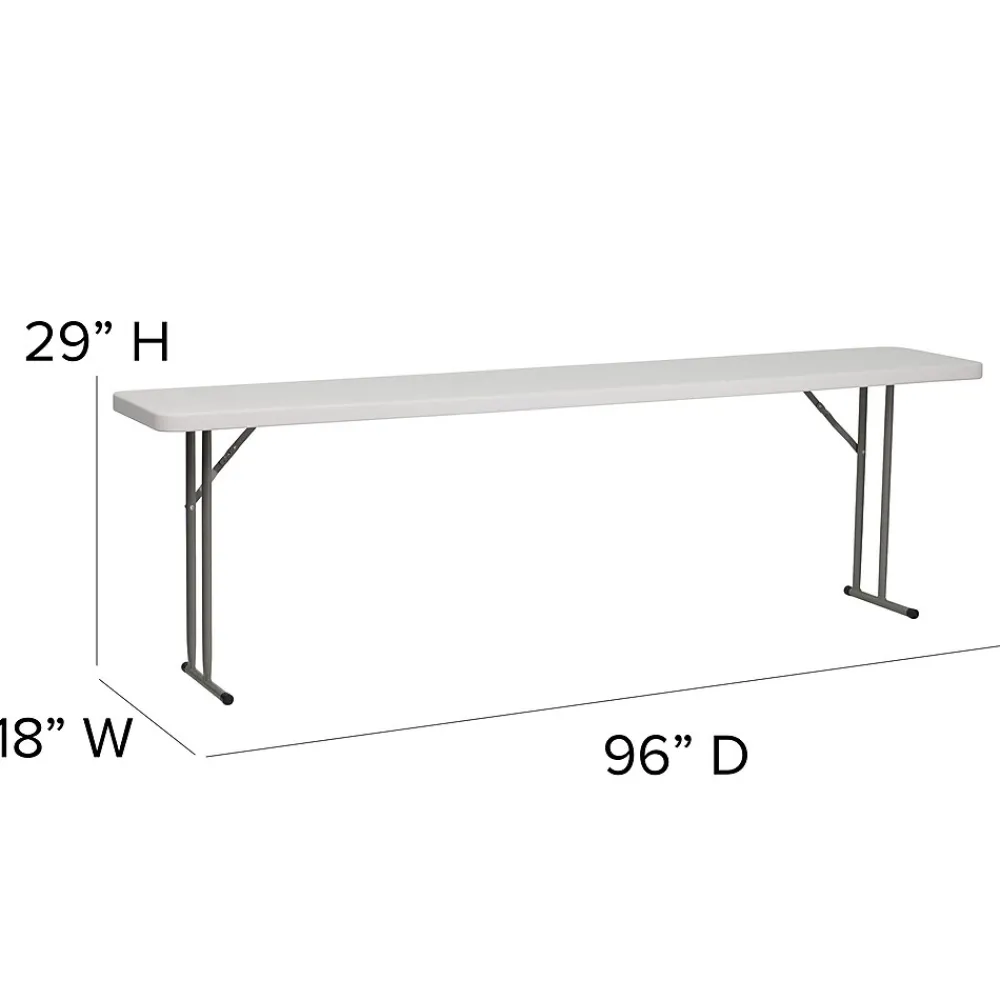 Fill that new designated training room with this narrow rectangular plastic folding table. The space saving design can fit multiple tables in small and large rooms making it the perfect training style table for any classroom or training facility. Have people pick up test packets and informational pamphlets on this perfectly sized folding table. Cleanup is simple on this durable, waterproof top to pick up spills quickly. This 8 foot folding table seats 4 people on one side of the table allowing all at the table a clear view of the board and instructor. When you want to store or transport the legs lock underneath the top. Folding tables can be your go-to table to setup your products at convention centers.