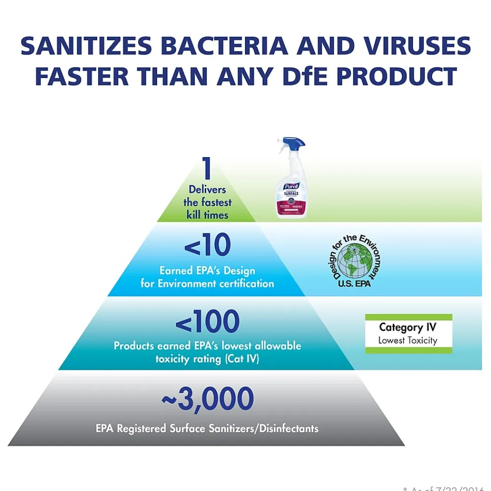 Formulated for convenience and ease-of-use, PURELL® Foodservice Surface Sanitizer has powerful germ-kill on the surfaces people touch most – yet is gentle enough to use on a child’s highchair with no rinse required. Patented fragrance-free formulation disinfects without any harsh fumes. It eliminates 99.9 percent of viruses and bacteria – including norovirus, E. coli, Salmonella, and human coronavirus in 30 seconds. With the EPA’s lowest allowable toxicity rating, it delivers the fastest overall disinfection time of any Design for the Environment (DfE) product.