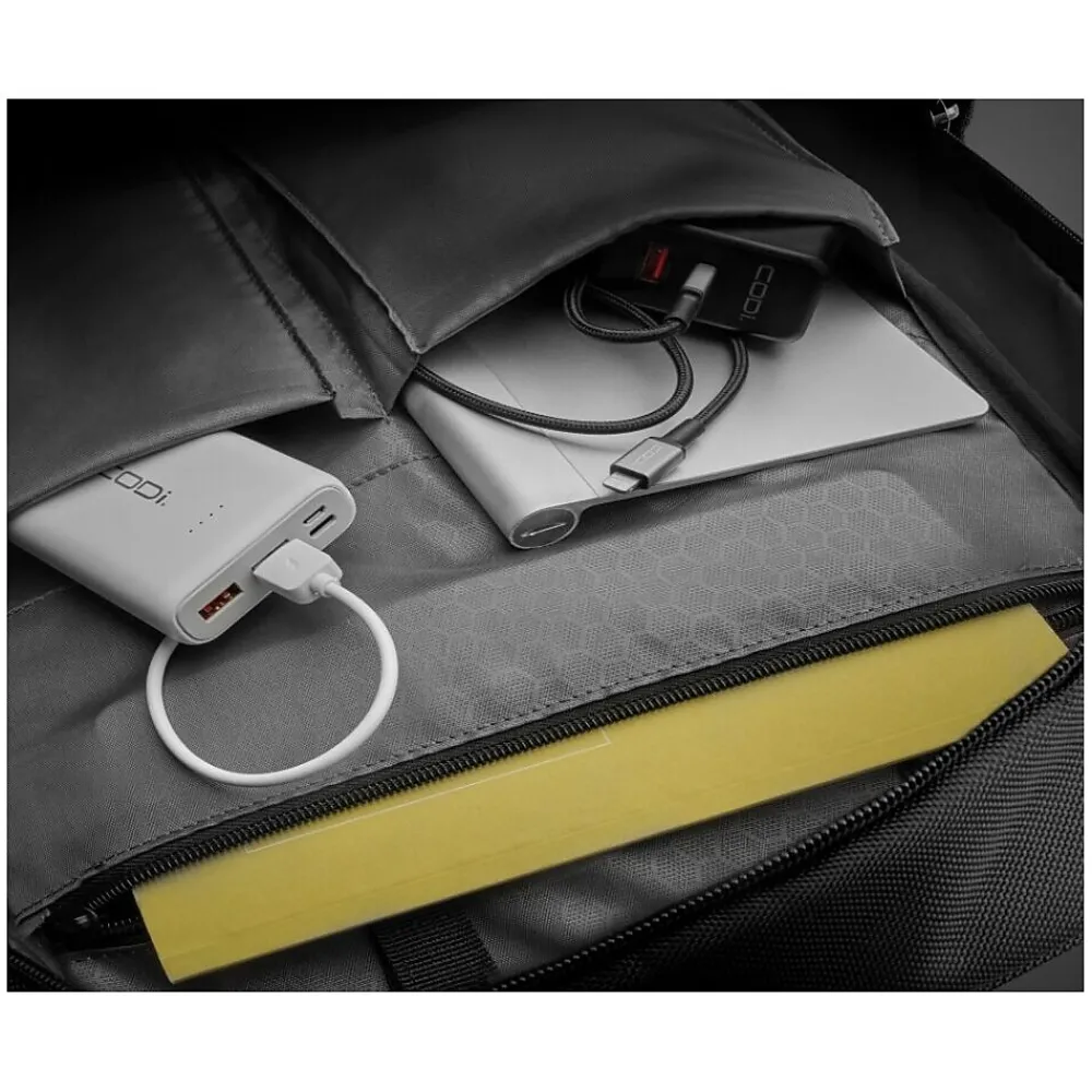 CODi’s Fortis 15.6″ Backpack protects your laptop and tablet with dedicated padded compartments. With multiple front pockets, a key fob, and slip pockets, you’ll have easy accessibility keeping you on the go and your essentials organized. This elite backpack also features unbreakable zipper tape, and lockable zipper pulls to keep your possessions safe and secure. The Fortis’s device compartment is TSA-friendly and opens flat to allow you to keep your device in your bag to move through security quickly. Whether you’re traveling for business or pleasure, the Fortis back strap slides over the handle of most rolling suitcases for added convenience. If you need to charge while on the go, there is an exterior USB port, pass-through cable management, and an internal pocket for your power bank, meaning you’ll be able to charge your phone or other devices without even opening your bag!