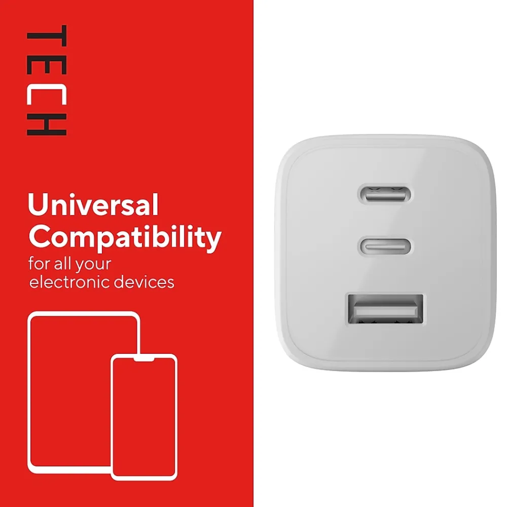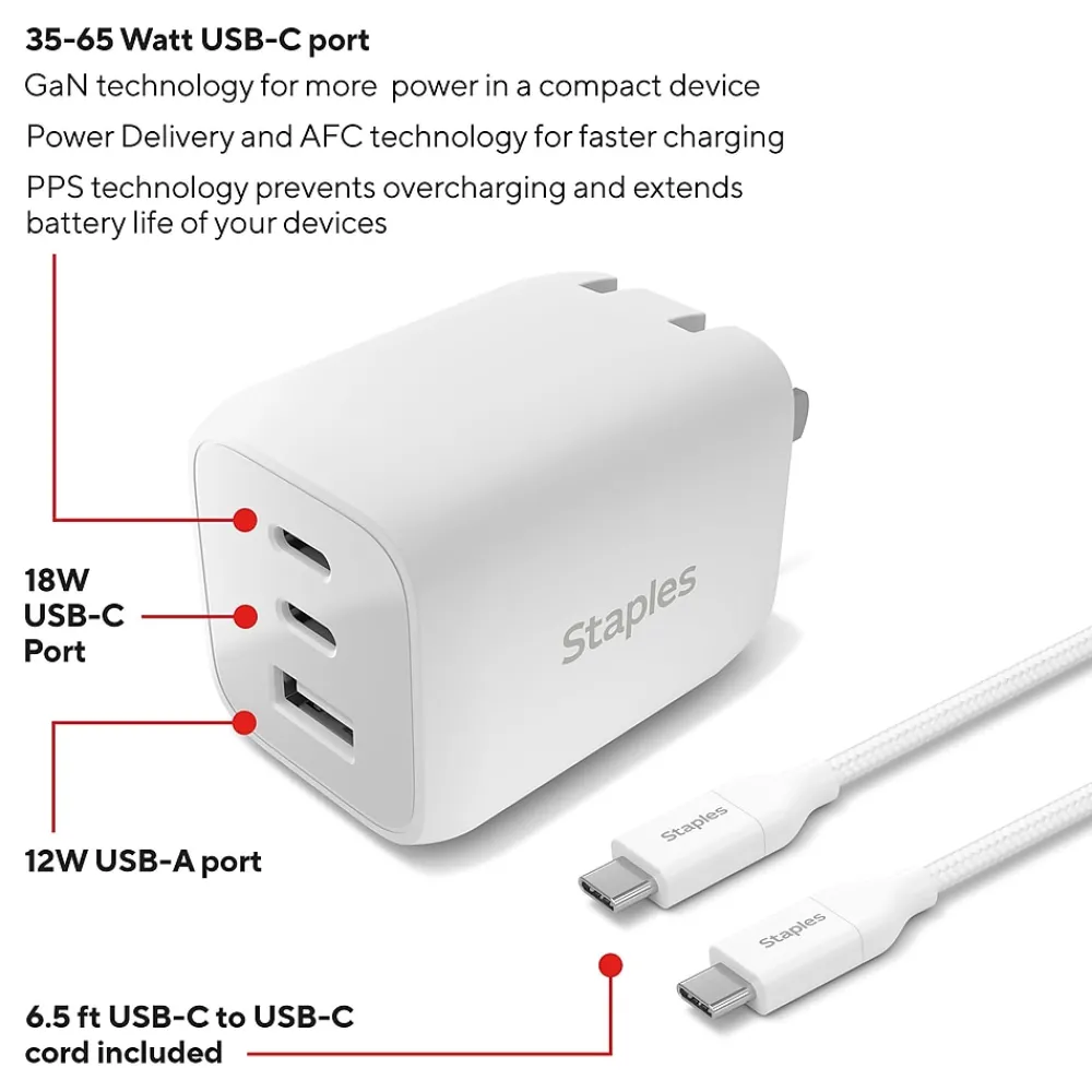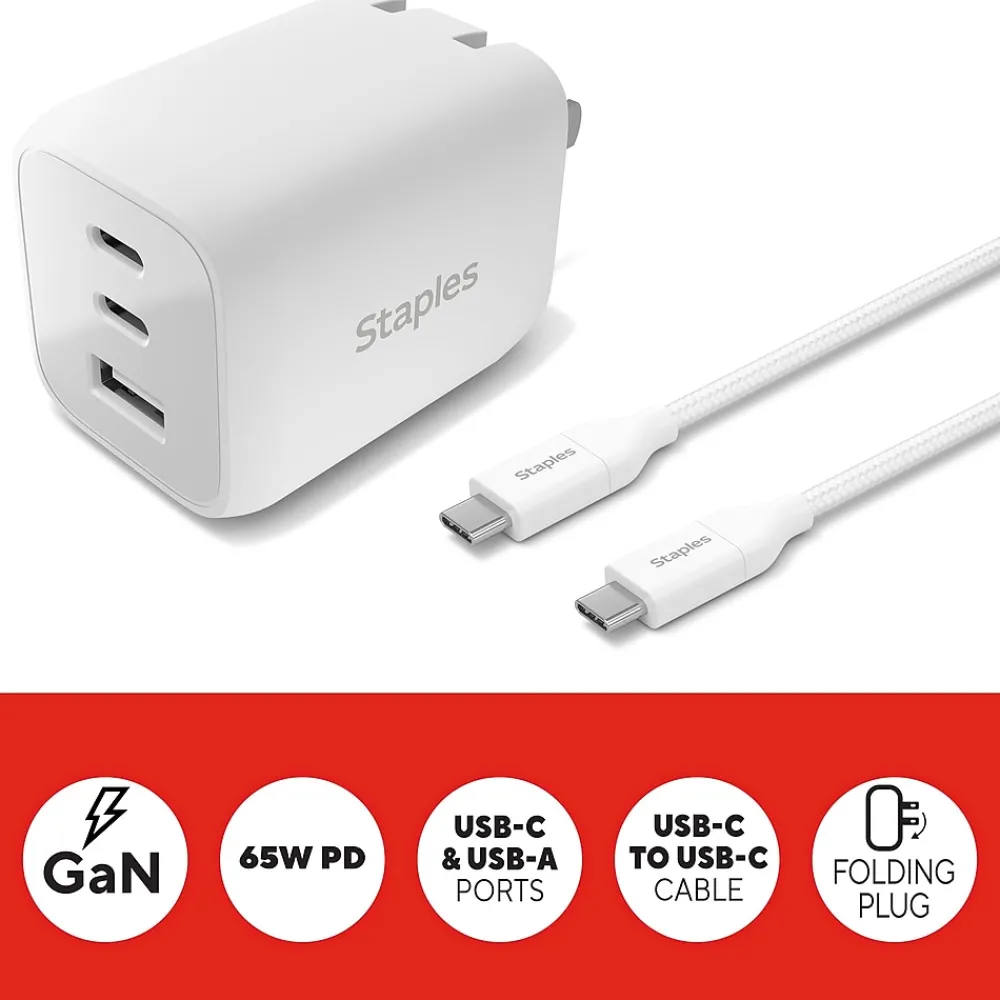 Great for a central charging station at the office or at home, this compact and powerful hub can charge three devices at once using two USB-C and one USB-A ports. This StaplesĀ® Three-Port USB-A & USB-C Wall Charger features innovative GaN technology to fully charge smartphones and tablets faster than standard chargers without the risk of overheating. Take this 65W charging dock anywhere with a foldable and ultra-portable wall plug. With the included 6.5ft long, durable braided 2.0 USB-C to USB-C cable, you can get extra reach and get your devicesā batteries back to 100%.