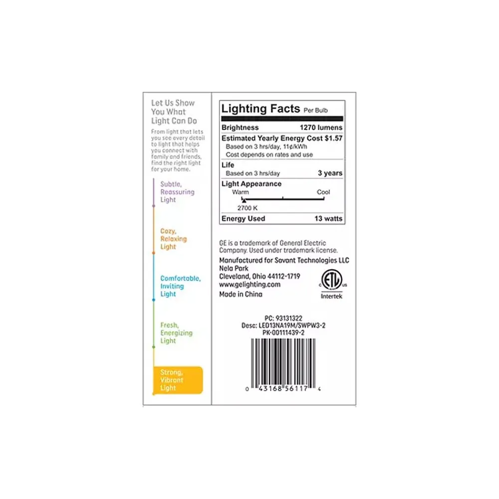 The GE Basic LED light bulb offers outstanding energy efficiency, long-lasting performance, and just-right brightness, all in one package. The bulb illuminates your home with warm, soft white light. Unlike CFL bulbs, this LED bulb features instant full brightness and is free of mercury. Great for frequently used fixtures: the LED’s long life and low energy use will help you save money on energy.