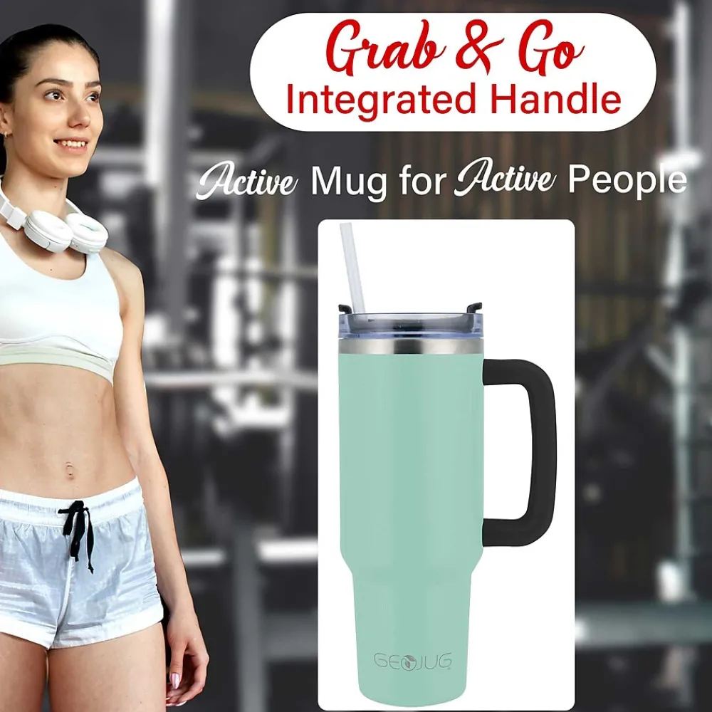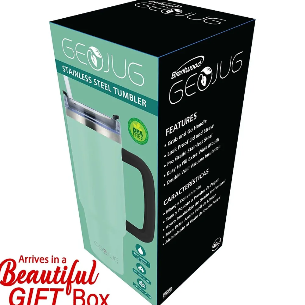 The Brentwood® Geojug 40-Oz. Insulated Stainless Steel Tumbler Cup with Handle, Lid, and Straw quenches your thirst on the go. Conveniently take your favorite drinks anywhere and everywhere with the integrated comfort handle. The leak-resistant lid keeps spills away while the straw provides endless sipping comfort. The smartly designed travel mug fits in all kinds of cup-holders so you’re always in arms-reach of your drink. Stainless steel double-wall vacuum insulation keeps your beverages super hot or ice cold for hours and never sweats. Tasteless and odorless, pro-grade stainless steel is highly durable and super-easy to clean.