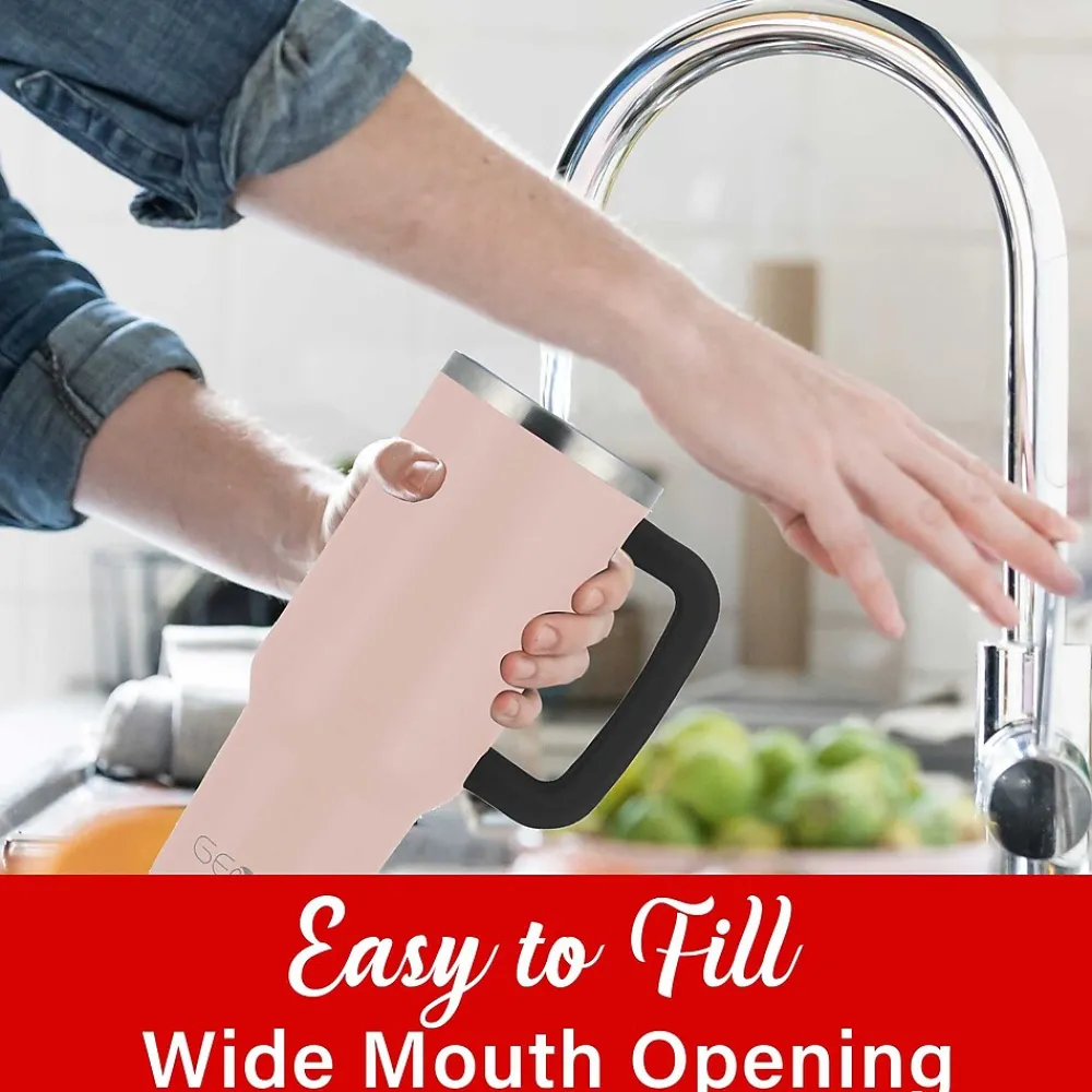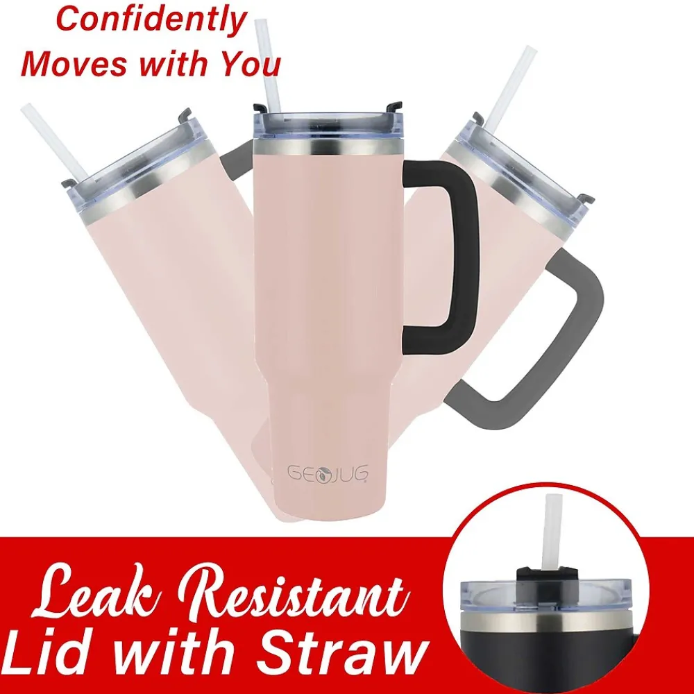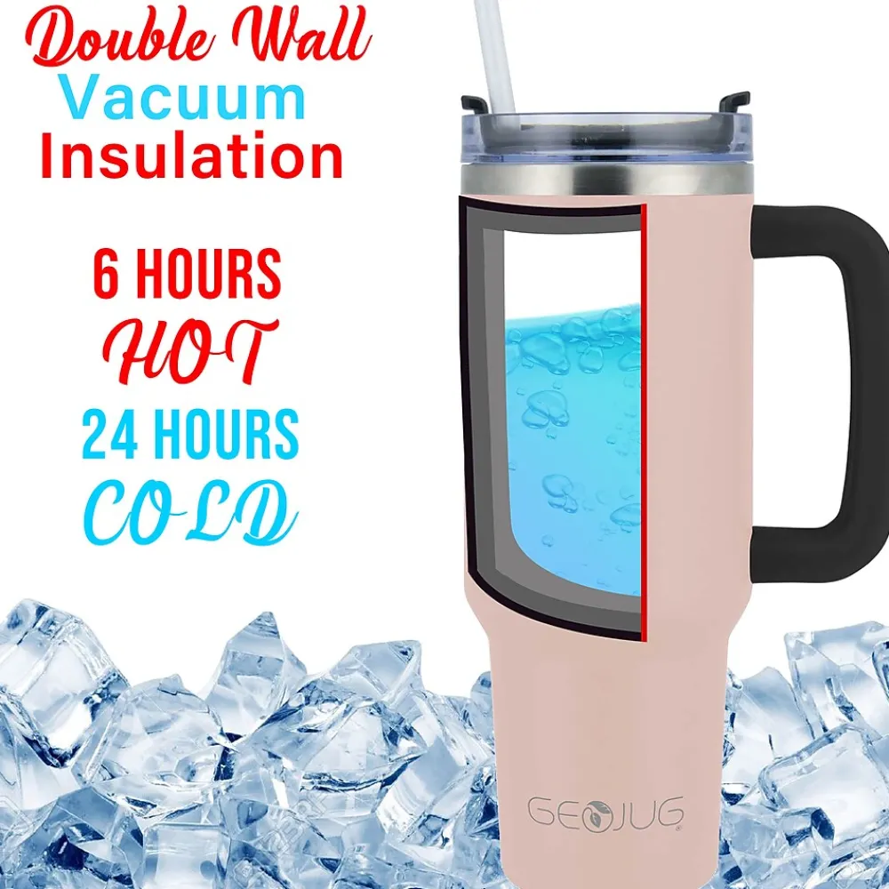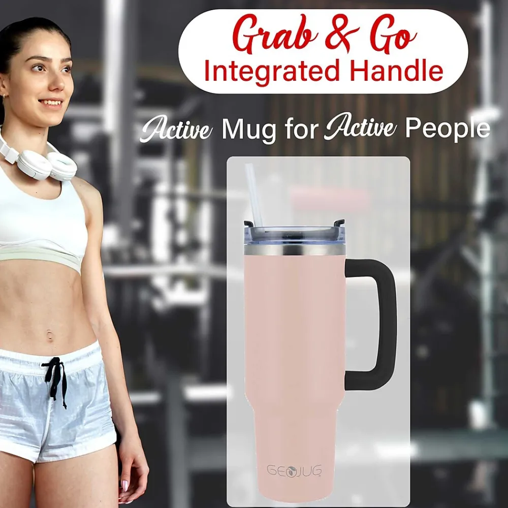 The Brentwood® Geojug 40-Oz. Insulated Stainless Steel Tumbler Cup with Handle, Lid, and Straw quenches your thirst on the go. Conveniently take your favorite drinks anywhere and everywhere with the integrated comfort handle. The leak-resistant lid keeps spills away while the straw provides endless sipping comfort. The smartly designed travel mug fits in all kinds of cup-holders so you’re always in arms-reach of your drink. Stainless steel double-wall vacuum insulation keeps your beverages super hot or ice cold for hours and never sweats. Tasteless and odorless, pro-grade stainless steel is highly durable and super-easy to clean.