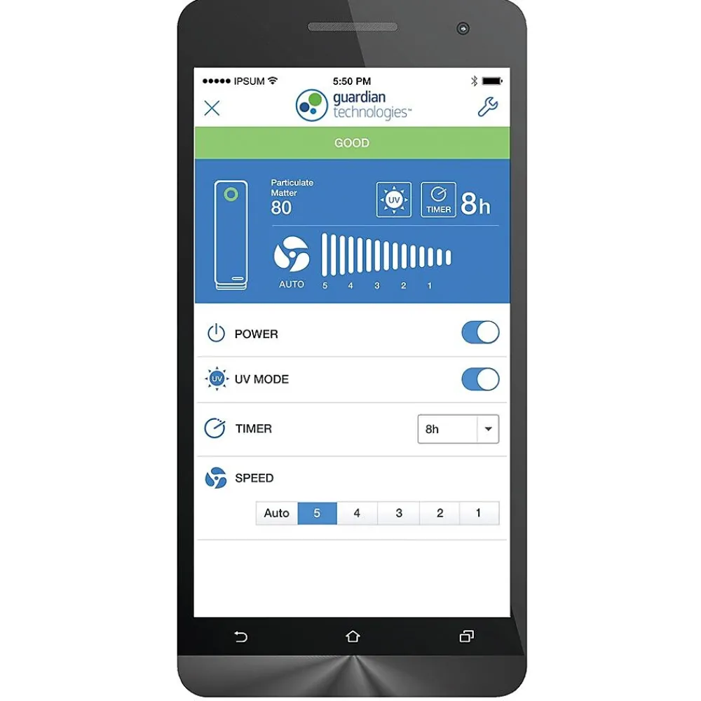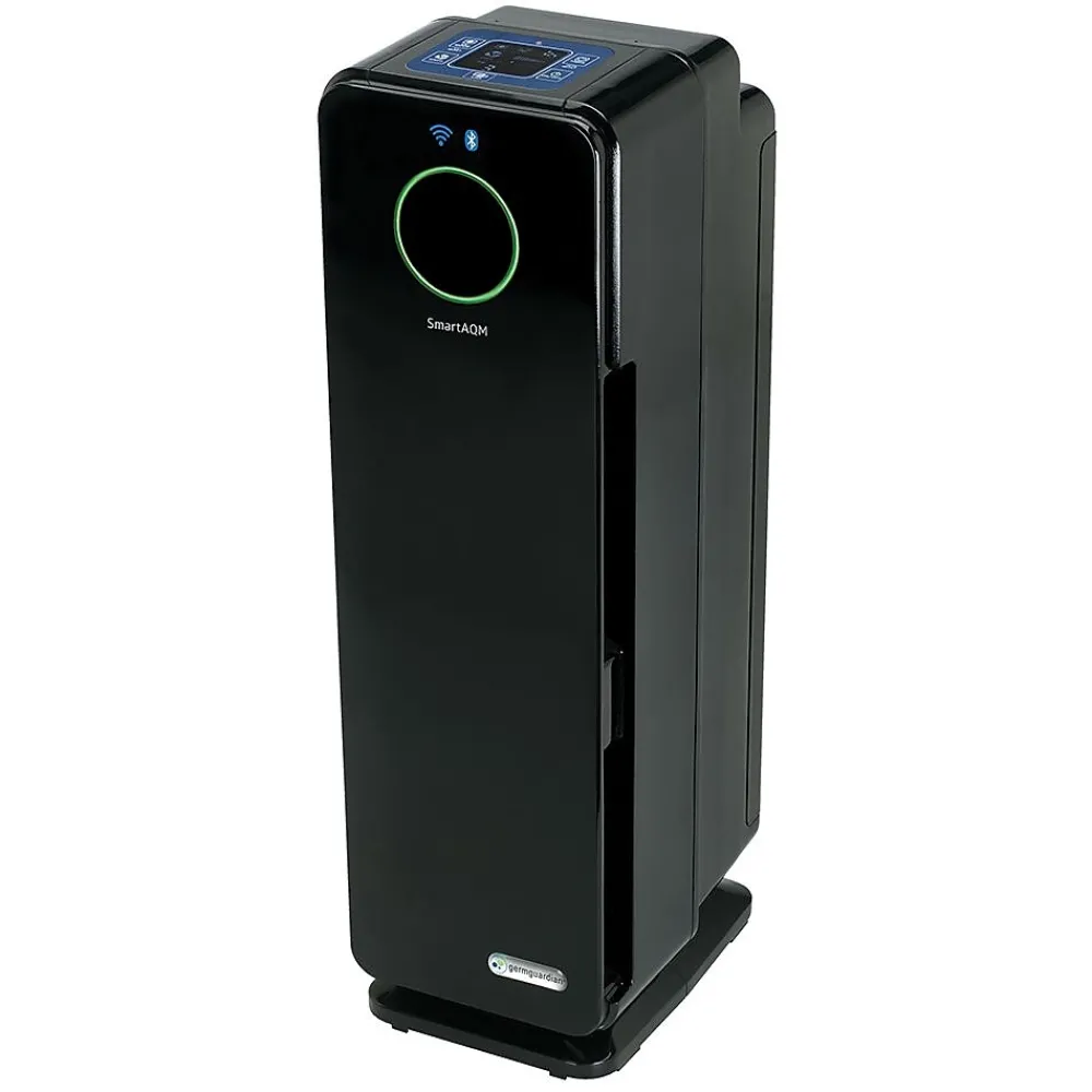 The 4-in-1 Air Purifier is perfect for allergy sufferers. True HEPA media captures 99.97% of allergens including pet dander, dust mites and pollen. More than just a filter, the UV-C light kills germs, while the charcoal filter captures odors. CADR Rated 100+ and standing 22″ tall, it is lightweight and ideal to use in small to medium sized rooms. The easy-to-use smart app that allows you to monitor the air quality in your home from EVERYWHERE! It includes SmartAQM, an Air Quality Monitor that detects the amount of particles in the air and automatically adjusts the speed to optimize room air quality when in auto mode. The Guardian Technologies App will tell you when you need to replace your filter or bulb and will also keep you updated on the allergy conditions in your area! Choose from five speeds, including a low speed that runs ultra-quiet and is energy efficient. The Elite Collection provides both form and function to provide a superior air cleaning system. The simple, stylish design looks great in any home environment.