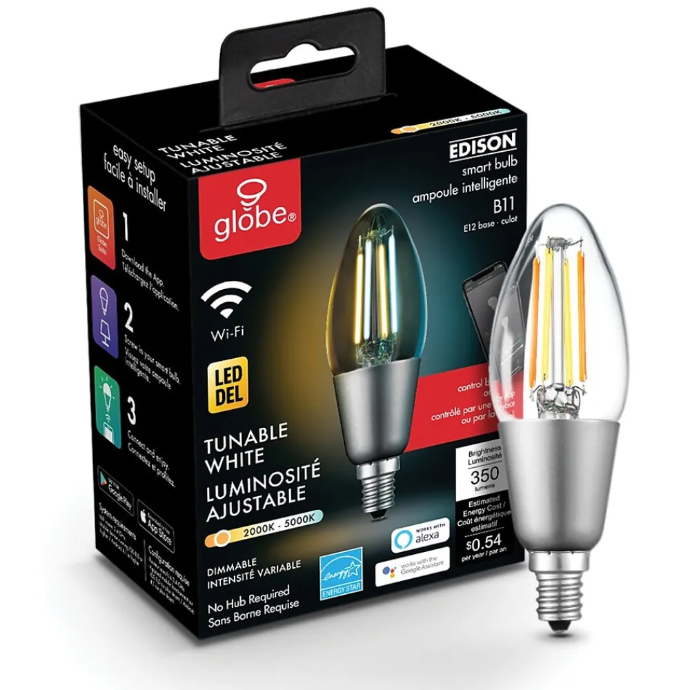 Useful to everyone, smart bulbs are the ideal start to home automation. If you can screw in a bulb you can set up smart lights. Using this Globe Electric smart, B11 E12 WiFi Tunable-White Edison-Style candelabra LED Bulb and the free GLOBE SUITE app, you can make your lights work for you. Using the app, you can make it seem like you’re home when you’re not by having lights come on at different times in different rooms. And you can turn on your lights before you get home from work so you have a light to arrive home with. Plus, the tunable white feature can echo your circadian rhythm by allowing you to have bright white light in the morning and then a relaxed warm white light for evenings. And that’s not all. This smart bulb resembles the vintage Edison filament bulbs from yesteryear, so you’ll love adding these to open socket fixtures or fixtures with clear glass shades to enjoy their sweet vintage look. Once installed and synced, you can control them hands-free by the sound of your voice using your Google Assistant, Alexa, or Siri. It’s so simple! It’s your home, just smarter.