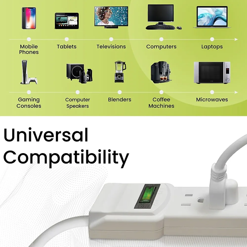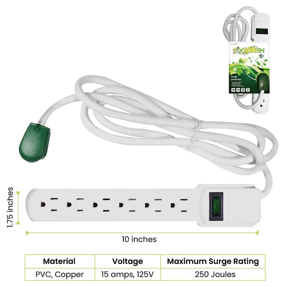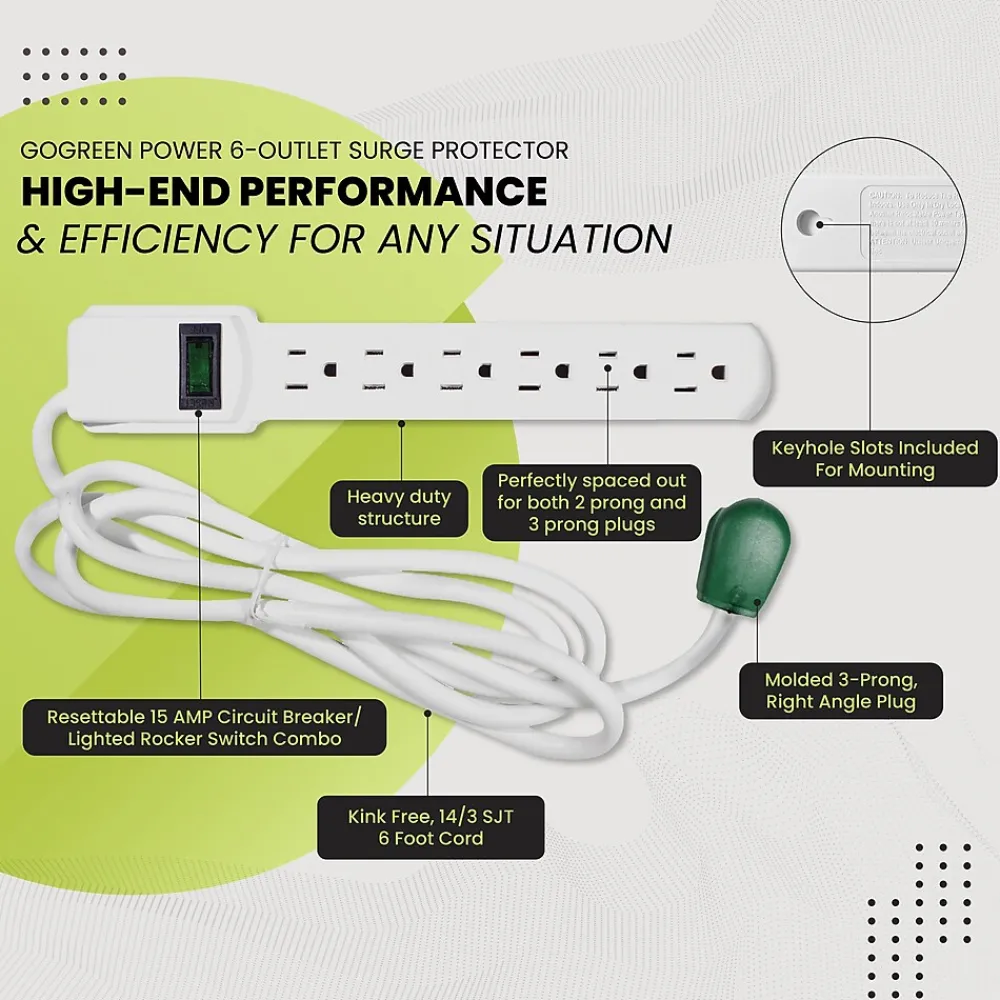 Sometimes you just need something a bit more heavy-duty to protect your computers, video game systems, televisions, and home appliances. Thankfully, the 6-Outlet Surge Protector has you covered with room to spare.With the GoGreen Power® 6-Outlet Surge Protector, you’ll have peace of mind knowing this 15 amp, 1875 watt circuit breaker is hard at work providing a whopping 250 joules of simultaneous protection for six adapters at once, making it a perfect defense against whatever Mother Nature throws your way. With an active indicator light to confirm operation, the 6-Outlet Surge Protector should be a standard feature in every room in your home.With a right-angle plug and extra-long six-foot cord, the GoGreen 6-Outlet Surge Protector implements the environmentally-friendly design of all GoGreen products with high-end performance and efficiency for any situation.