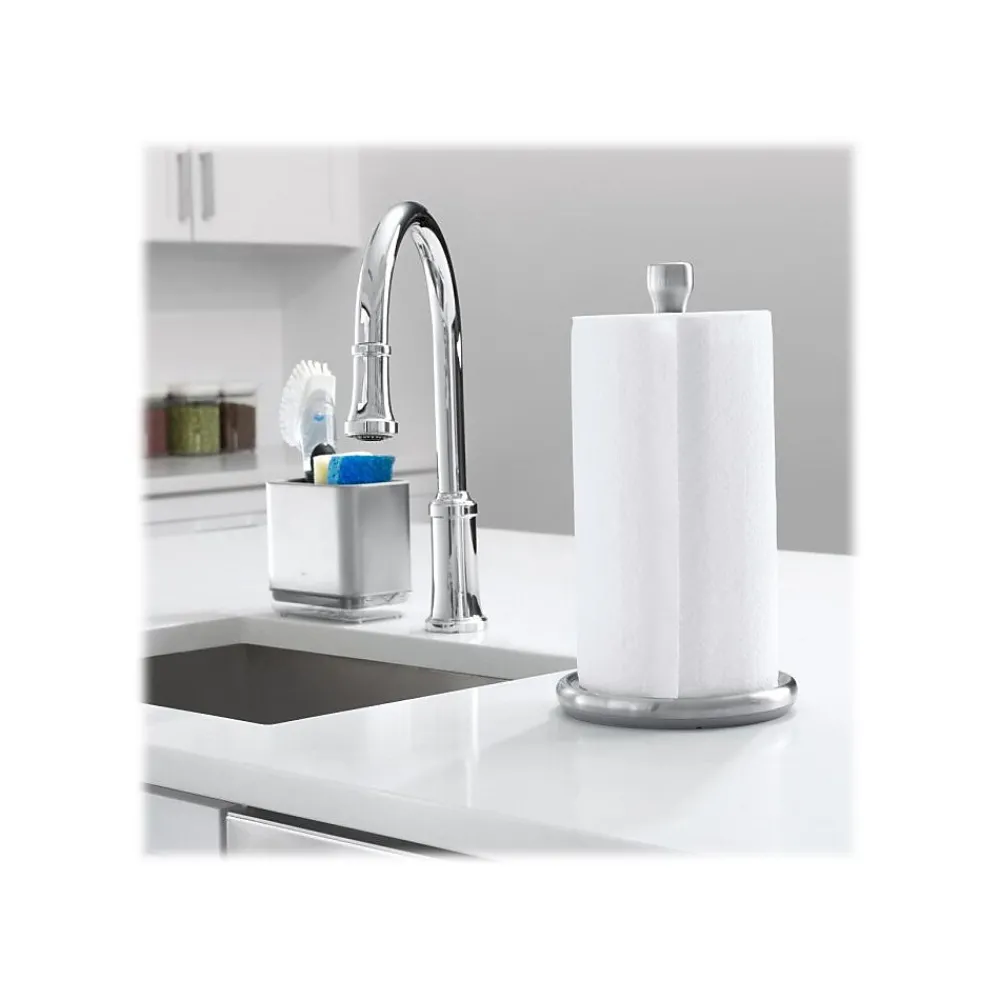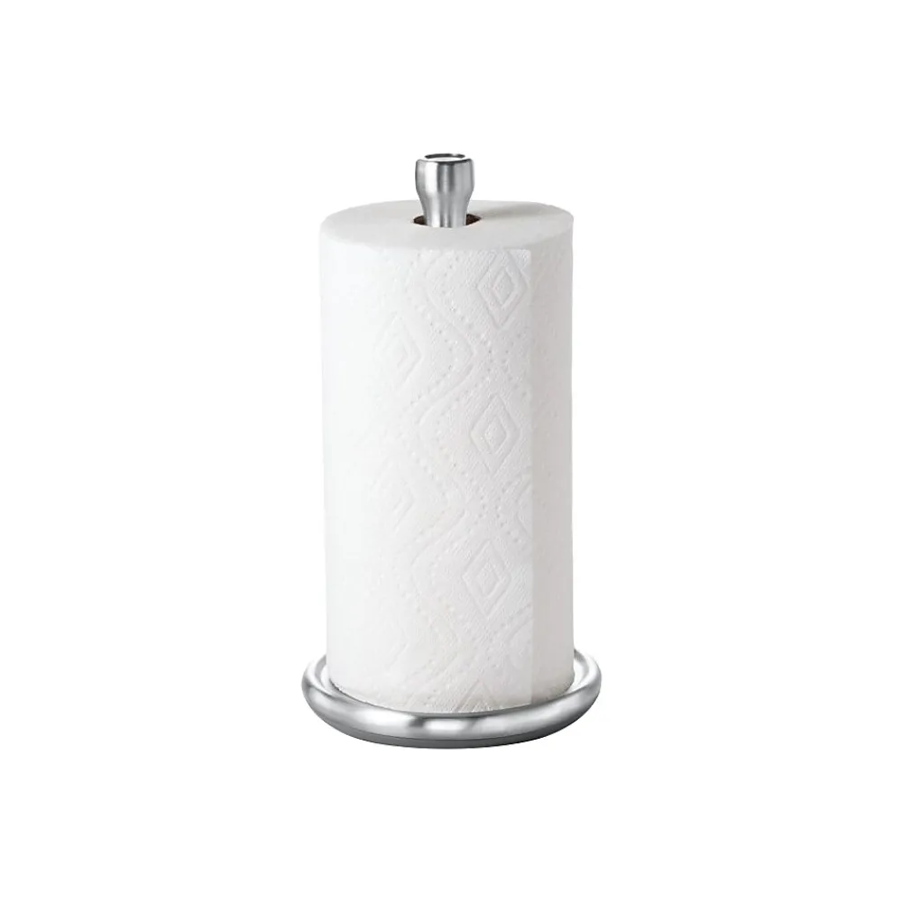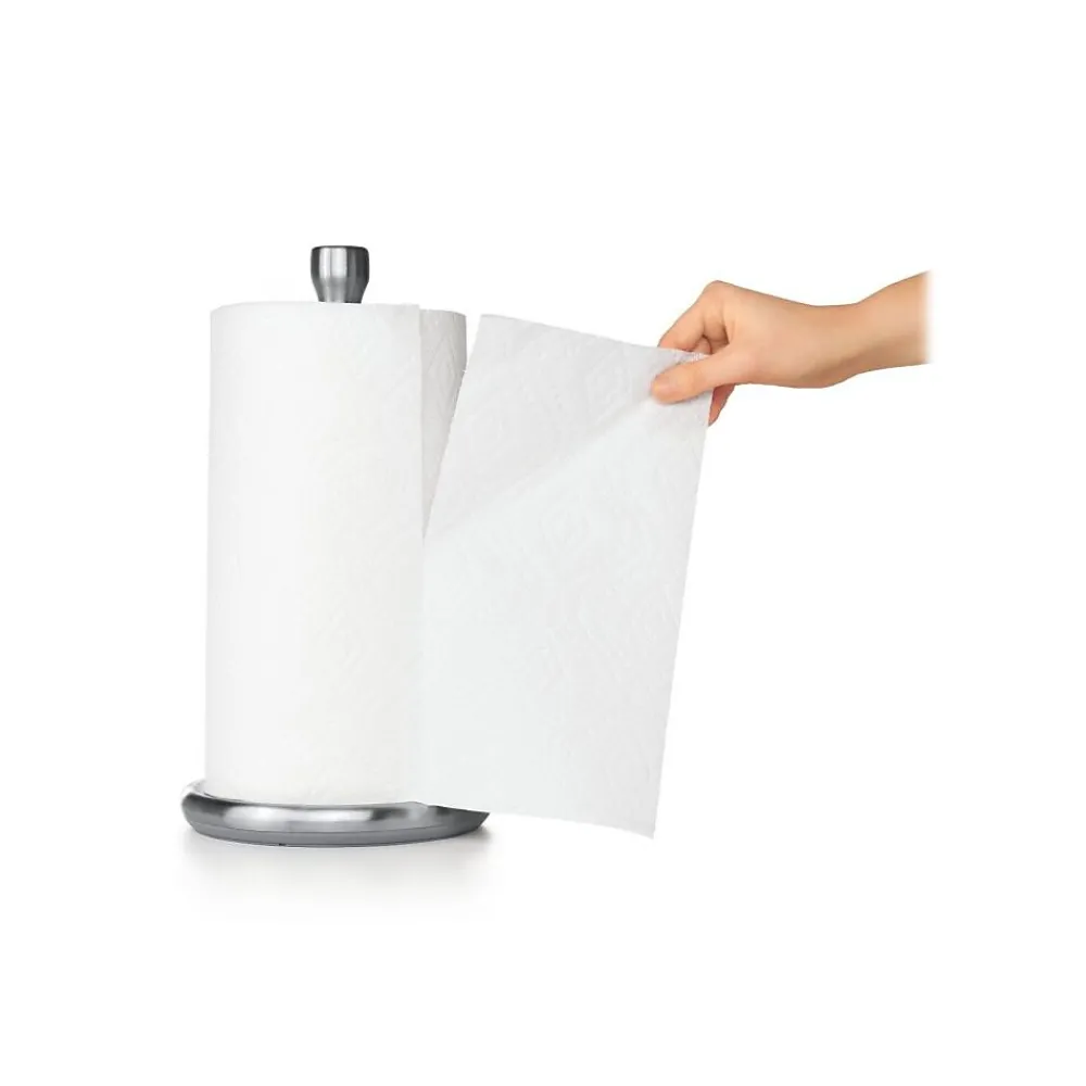 The OXO Good Grips paper towel holder clears countertop space and makes paper towels more accessible than ever. The smooth rotation allows for easy, one-handed ripping, and the knob is designed to keep even large rolls in place. The angle of the base makes installation easy and the die-cast bracket and knob will never rust, and you can install it in walls or under cabinets.
